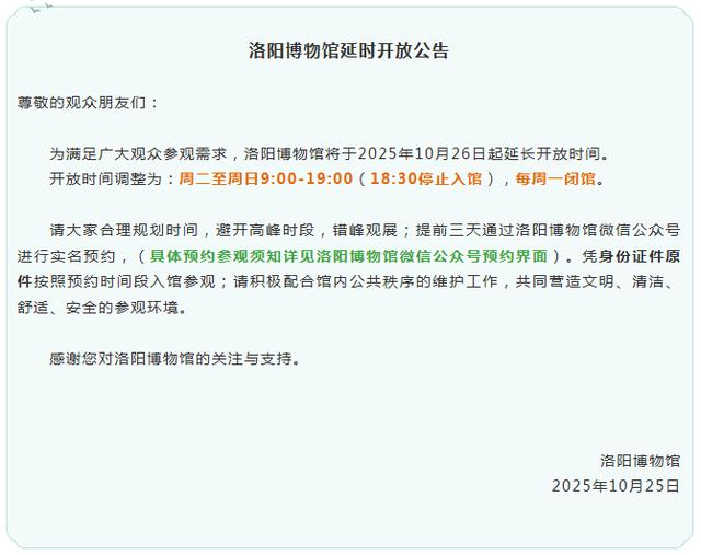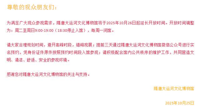 10月26日,记者从洛阳博物馆、隋唐大运河文化博物馆获悉,为满足广大观众参观需求,博物馆于今日起延长开放时间。请大家合理规划时间,避开高峰时段,错峰观展。