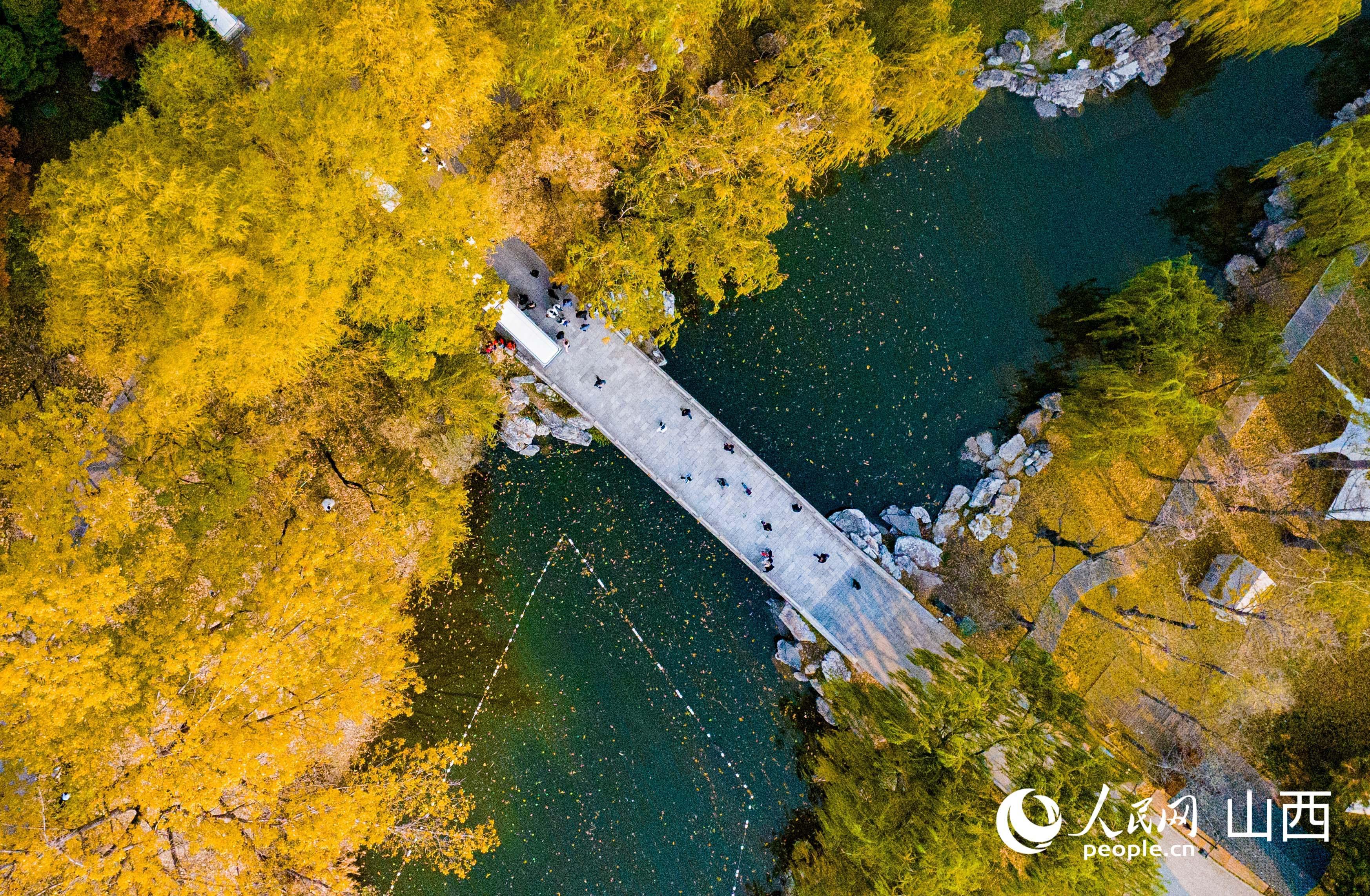 航拍晋祠公园,游人在深秋漫步。人民网记者 王帆摄