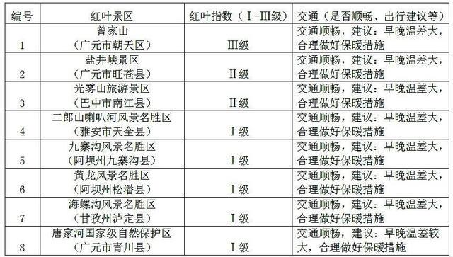 值得一提的是,近期较适宜观赏红叶的景点主要分布在四川省东北部曾家山、盐井峡、光雾山景区。但今年受闰月和气候等因素影响,预计红叶观赏期较往年推迟10~15天。