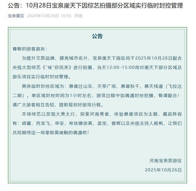 10月26日,河南宝泉旅游区发布公告,宝泉崖天下园区将于2025年10月28日配合央视大型综艺《“味”你而来》进行拍摄,当天12:00-15:00将对崖天下部分区域及游乐项目实行临时封控管理。