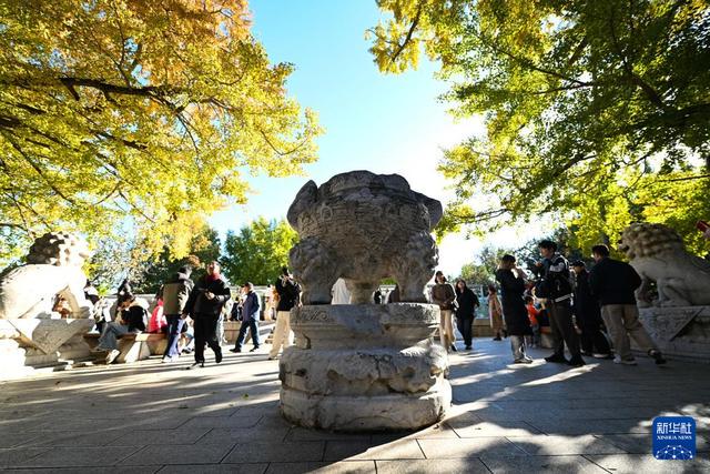 秋冬之交的北京石刻艺术博物馆(也称五塔寺)内,银杏等大面积泛黄,石刻文物掩映在绚烂的色彩中,吸引不少游客前往观赏。