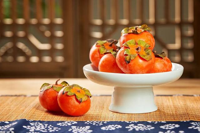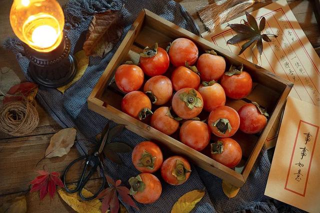 柿子还代表着品德。《尔雅》中说柿子有七德:“一寿,二多阴,三无鸟窠,四无虫蛀,五霜叶窠玩,六嘉实可啖,七落叶肥大可以临书。”柿树长寿是真的,可达到300年以上,据说在陕西富平,现存最长寿的柿子树,已有1200多岁。古人将柿子视为盘中珍味,古画中常见柿子的身影。《韩熙载夜宴图》里的长案上摆放着各类吃食,除了茶酒糕点,最引人注目的就是四颗朱红带蒂的柿子。柿子还被明太祖朱元璋封爵为“凌霜侯”,这可能是柿子最荣耀的高光时刻了。