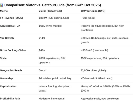 Ali进一步比较了两家公司的表现:Viator增长仅14%,利润率7%;而GetYourGuide增长超过25%,已经盈利,虽然具体盈利数额未披露,但在资本市场叙事上占据了明显优势。