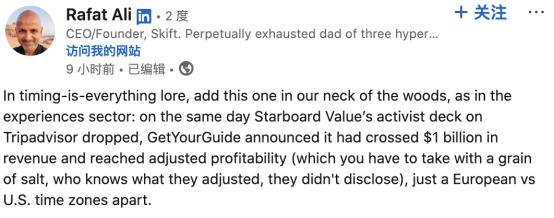 就在激进投资机构 Starboard Value 对其最大竞争对手 Viator/Tripadvisor 发布评估报告的同一天,GetYourGuide宣布了盈利和营收突破。Ali认为,这绝非巧合,GetYourGuide显然提前洞察到了竞争格局的变化。
