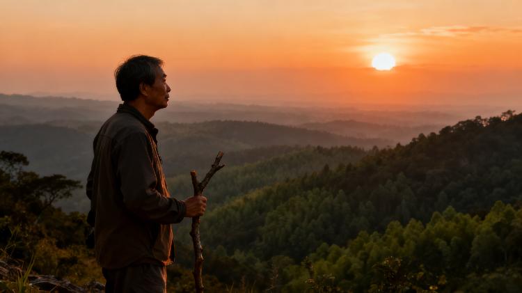 “下山路上,遇逢夕阳,远处金佛山总像是发着金光,形成一种庇佑的感觉。”