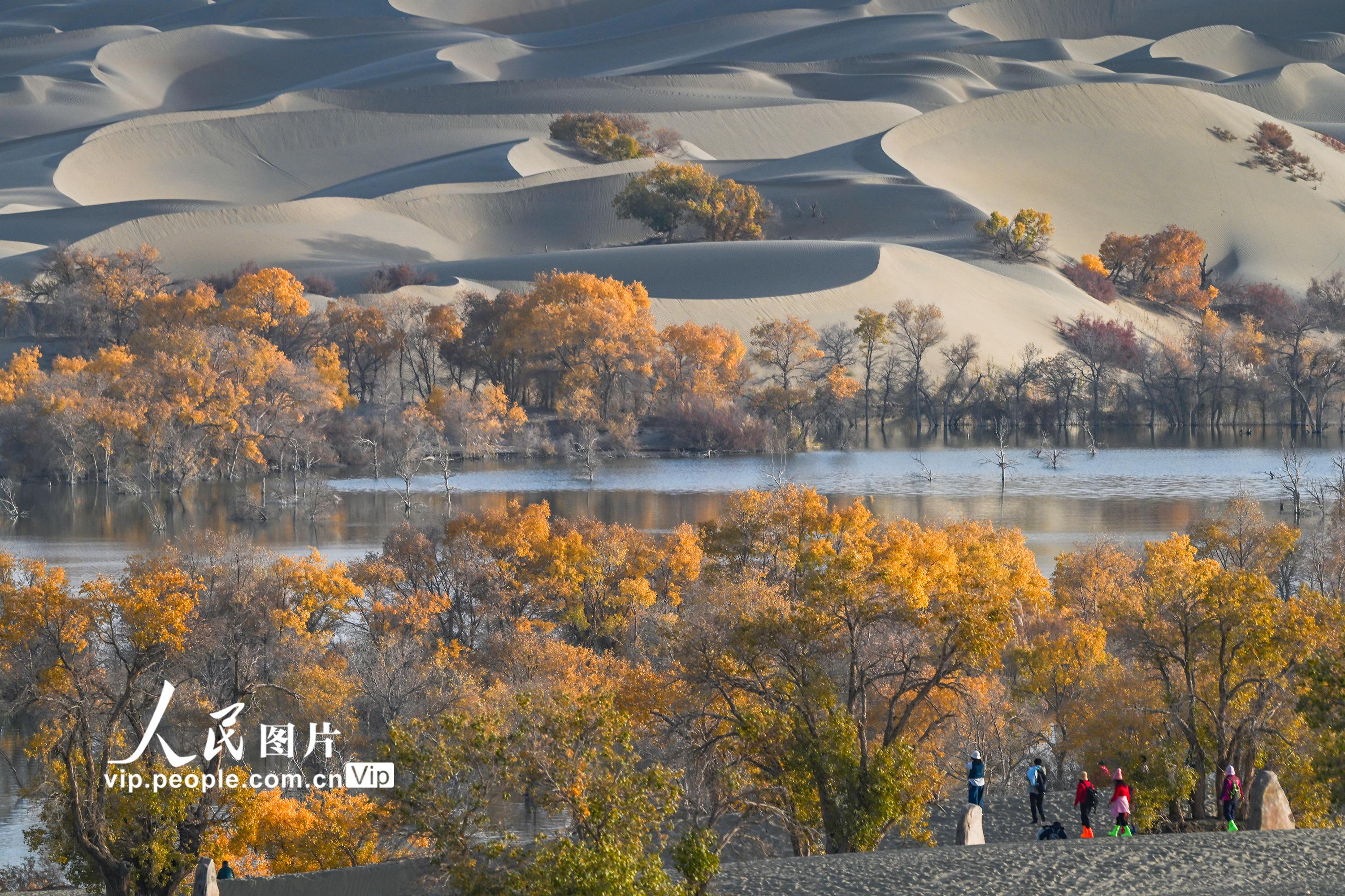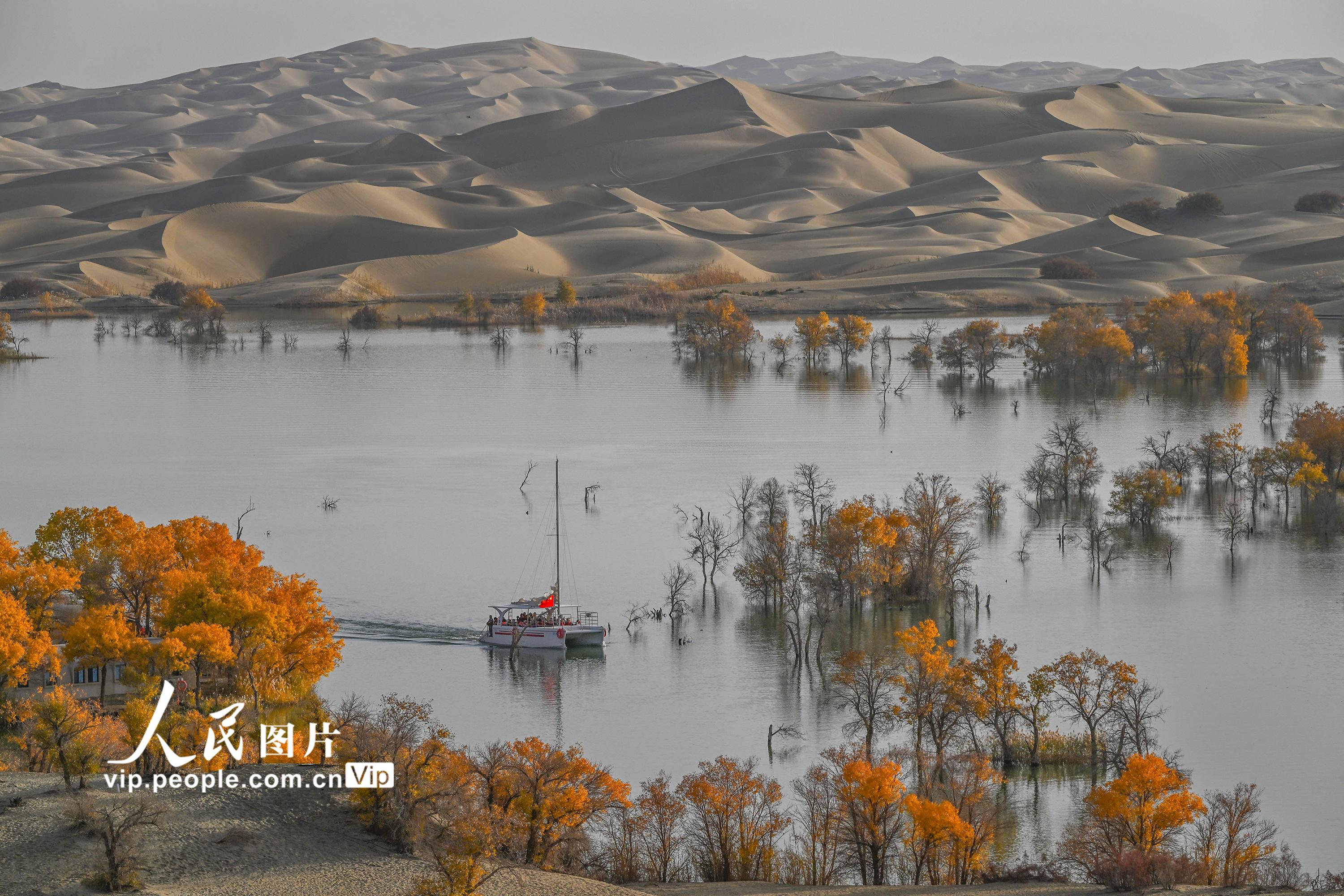 2025年10月26日,新疆维吾尔自治区尉犁县葫芦岛景区,游客乘船游览,欣赏大漠胡杨美景。韩峻摄(人民图片网)