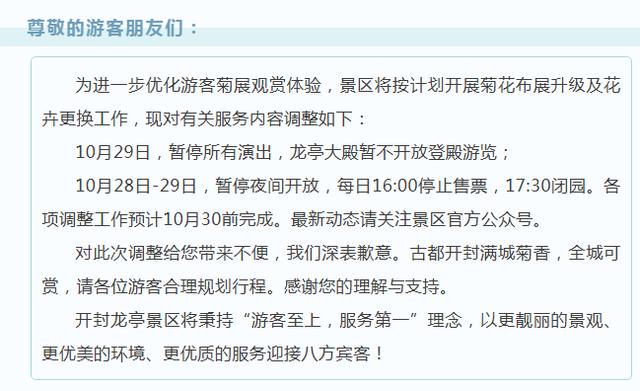 10月28日,记者从开封龙亭景区获悉,为进一步优化游客菊展观赏体验,景区将按计划开展菊花布展升级及花卉更换工作,现对有关服务内容调整如下:10月29日,景区暂停所有演出,龙亭大殿暂不开放登殿游览;10月28日-29日,暂停夜间开放,每日16:00停止售票,17:30闭园。各项调整工作预计10月30日前完成,景区最新动态请关注官方公众号。
