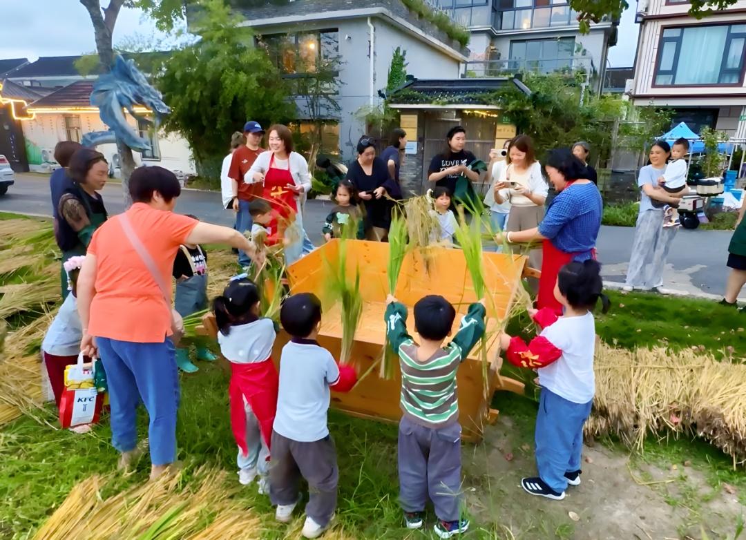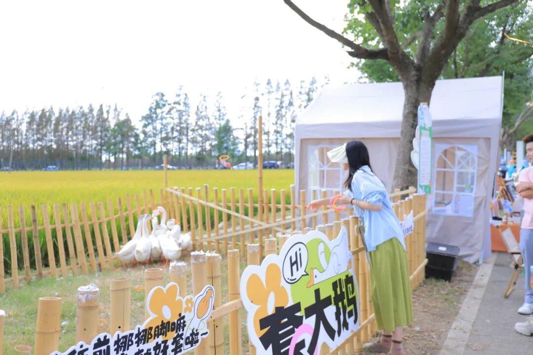 白天,这里是好戏连台的田园嘉年华,散布于田间的艺术装置邀请人们步入稻浪。松江兴旺村的“稻蛙共生”项目成为流量担当,亲子家庭排起长队体验田间钓蛙的野趣;亲子农事体验区里,孩子们亲手挖红薯、种白菜,而一旁的无人植保机、智能拖拉机则展示了现代农业的科技图景。田间市集汇聚了40多家特色商户,松江大米等地理标志产品以米糕、米浆等形态勾起味蕾上的乡愁,城市文创与乡村手工艺品在此交汇。