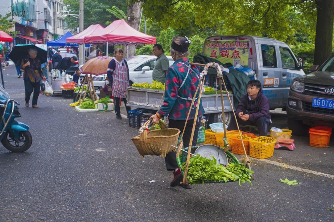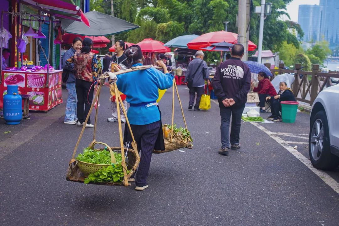 邂逅安顺的这个民生市集纯属偶尔,本来已经订好房间,但顺路总要打卡一下当地的著名景点的,就特意到“虹山湖公园”溜达一圈,没想到这里竟然是航拍的“禁飞区”,当即深感郁闷。好在当时只感觉在身边来来往往的除了附近居民,还有不少扛着各种蔬菜瓜果的摊主们出入,看上去既显得十分忙碌辛苦,神态却又自带几分收获满满的安逸,当即就“逆流而上、埋头奋进”,往两边摆满摊位略显拥挤的东山路深处“钻”去。