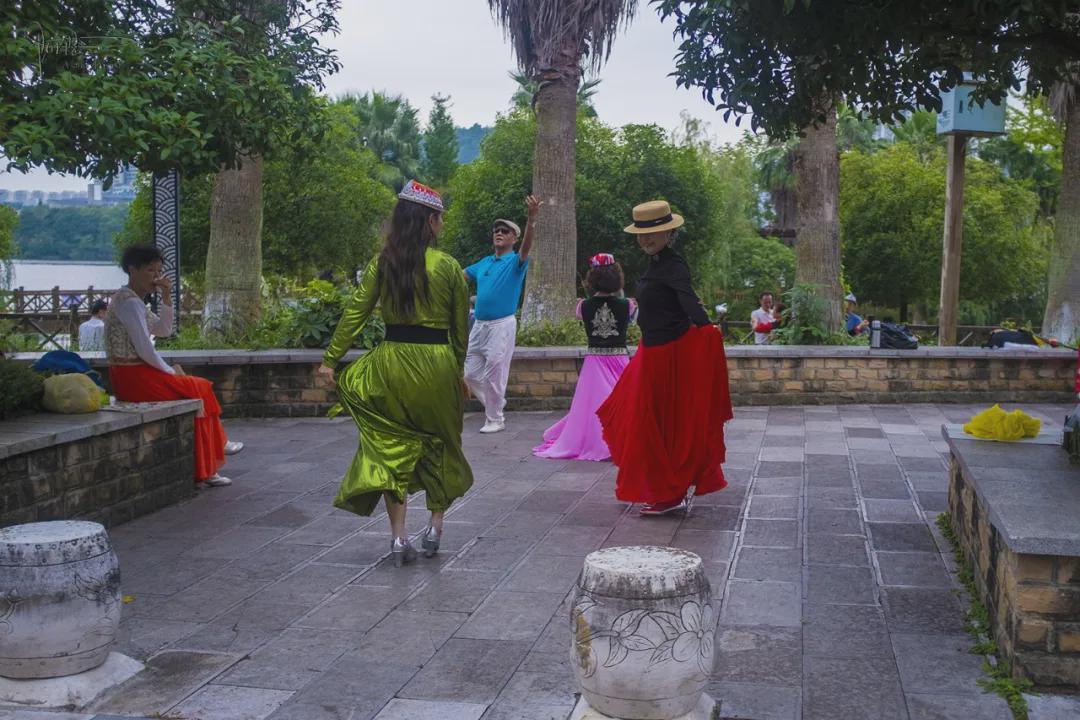 这个选择很正确,因为当时正好处在市集的中间位置,不仅能“瞻前顾后”,还能直达旁边的公园广场,于是让我也领略到了安顺的人民舞者的专业。只见他们个个身着色彩鲜艳的舞蹈服装,伴着具有民族风的音乐时而翩翩起舞,时而坐立于一侧相互交流讨论,竟然都非常认真和敬业。