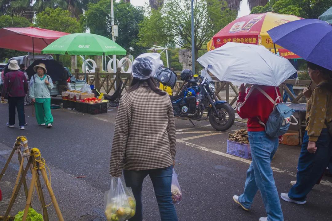 巧合的是,等我来回游走一遍,刚品尝完当地小吃,一场大雨便悄然而至,大家纷纷到路边搭着大棚的摊位处避雨,而摊主们大多习以为常似的乐呵呵的接纳,并不会做出“拒人于千里之外”的举动。当然,也有很多市民大概看过预报,所以自带各种“雨具”,此时便相当镇定地用上了。