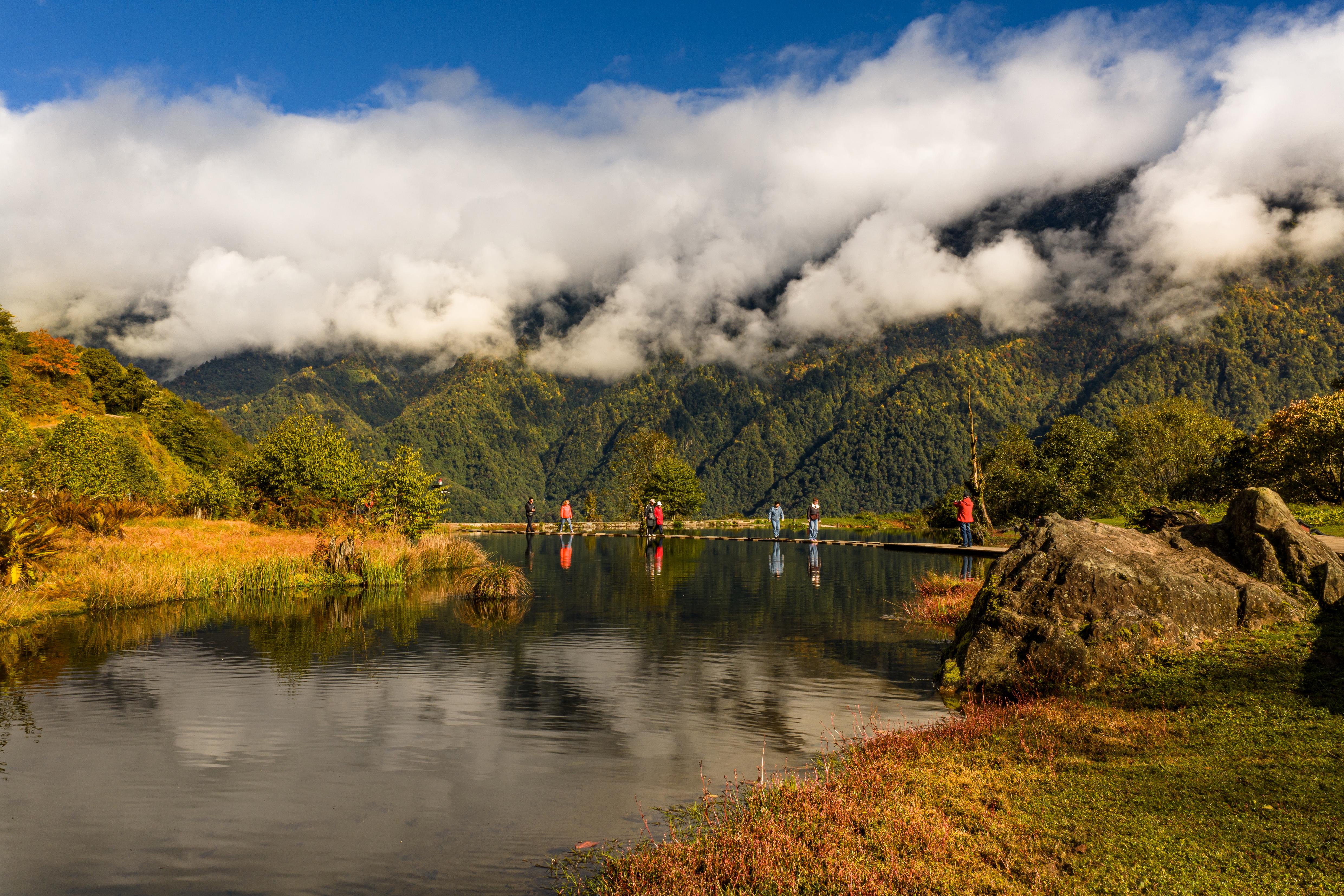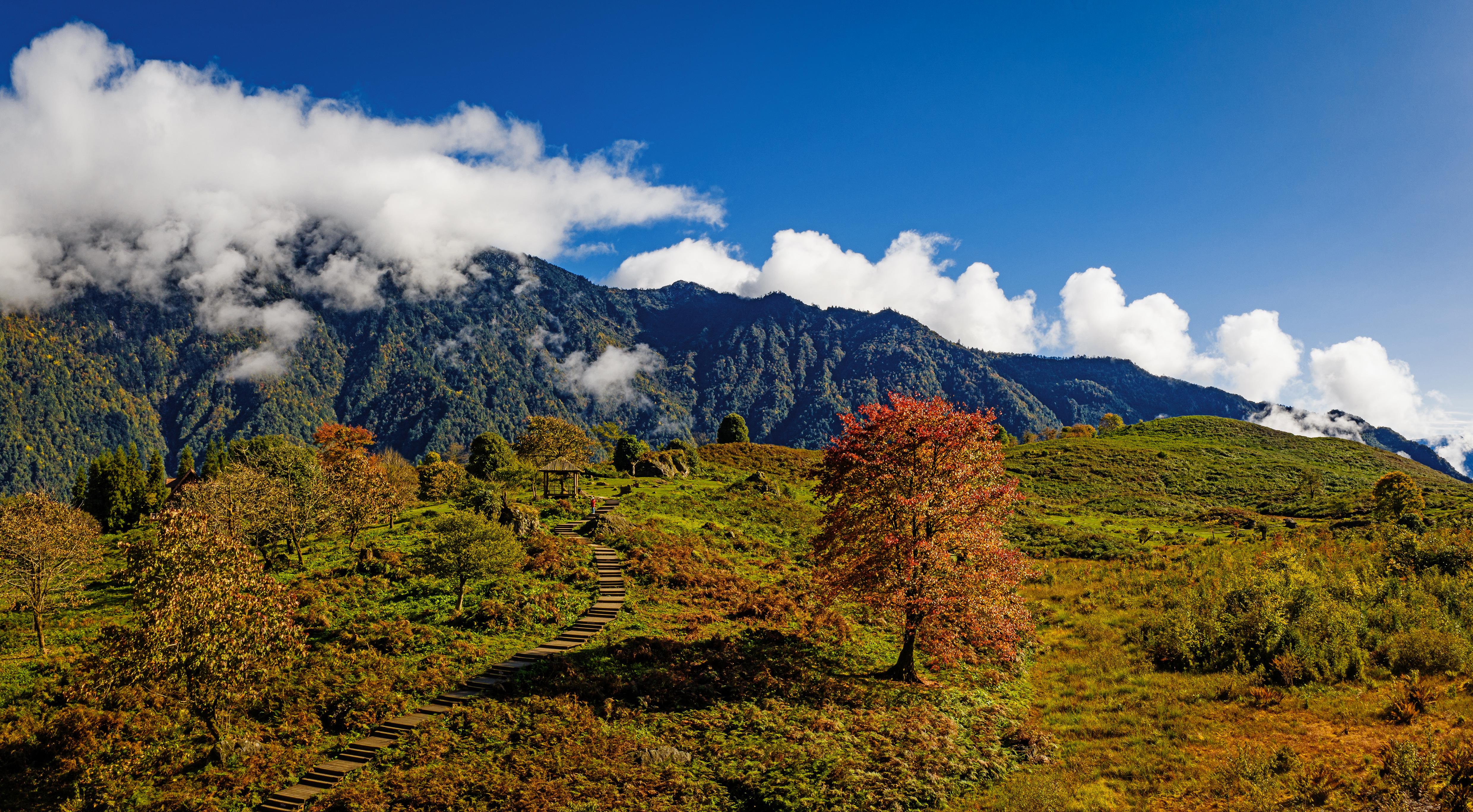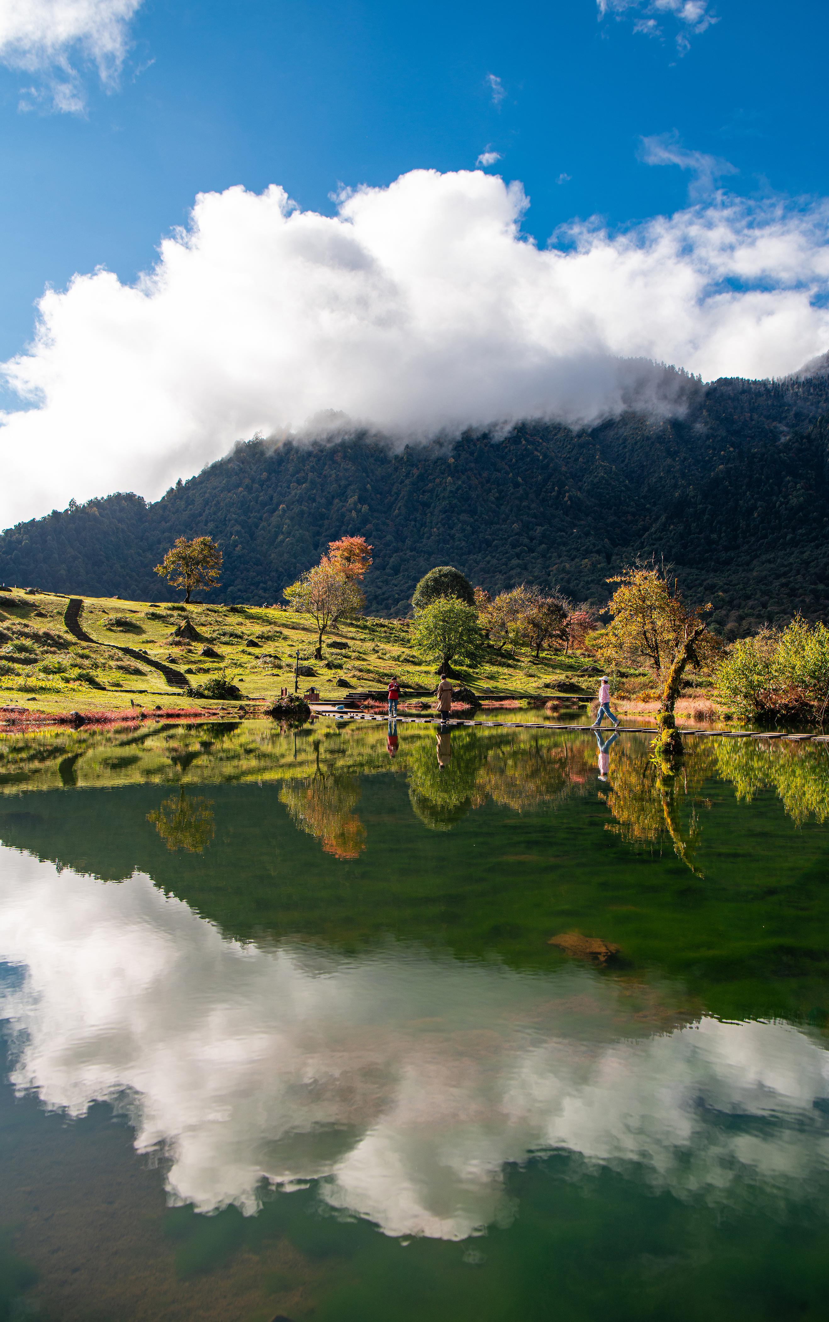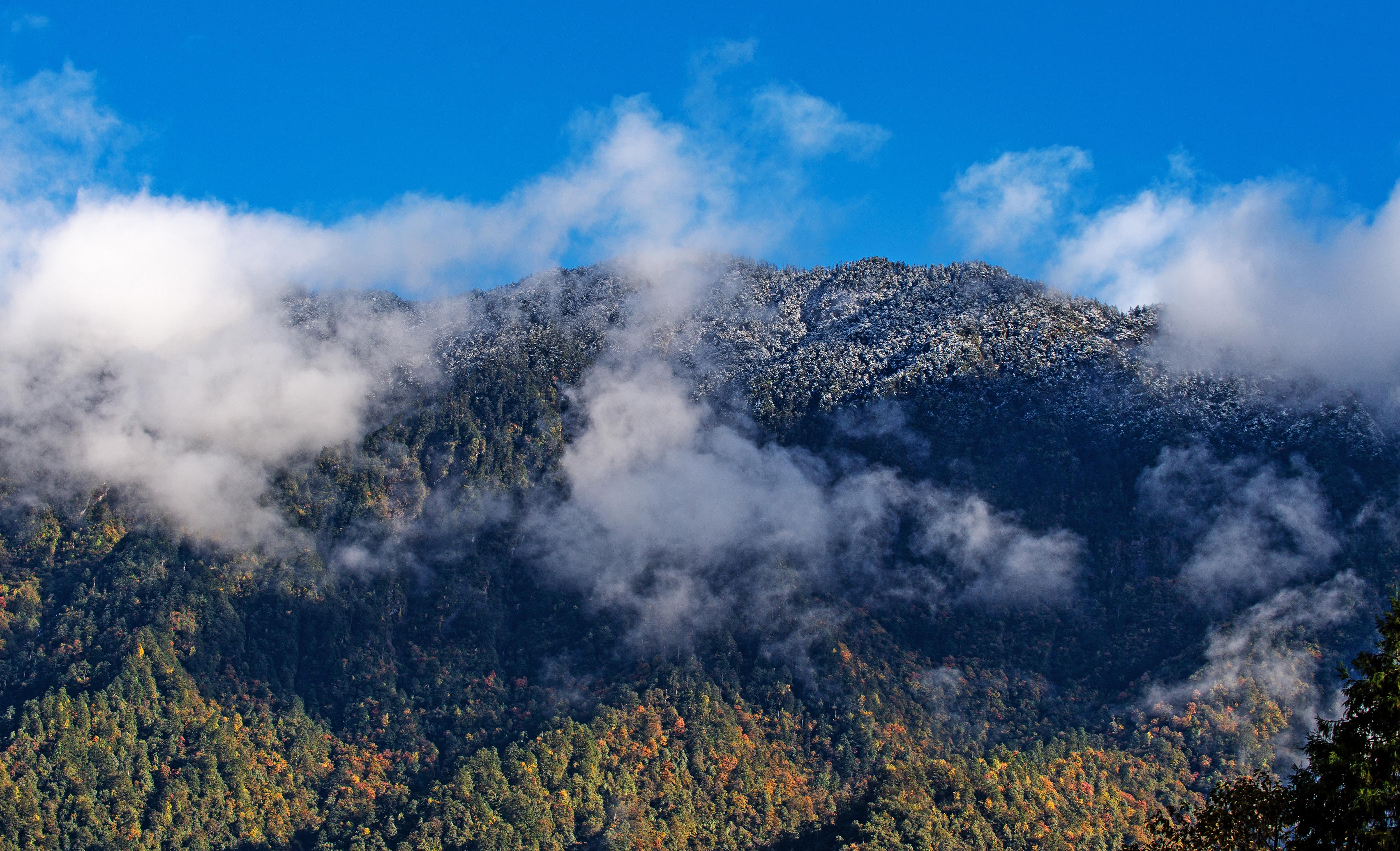 在四川省乐山市峨边彝族自治县的黑竹沟景区,多彩的树叶与蓝天、白云相映,宜人的景色吸引游人前来欣赏。