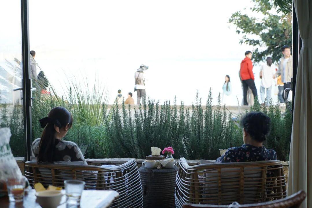 除了日出,丁达尔光束穿透云层的绮丽、雨后彩虹横跨湖面的绚烂、海菜花漂浮水面的清新……店里的每一扇窗都是大自然的画框。晨昏交替,四季更迭,流动的生态画卷不断变换。即便并非旅游旺季,店里依旧客流不断,窗边的游客排队打卡,只为以洱海为背景定格美好瞬间。