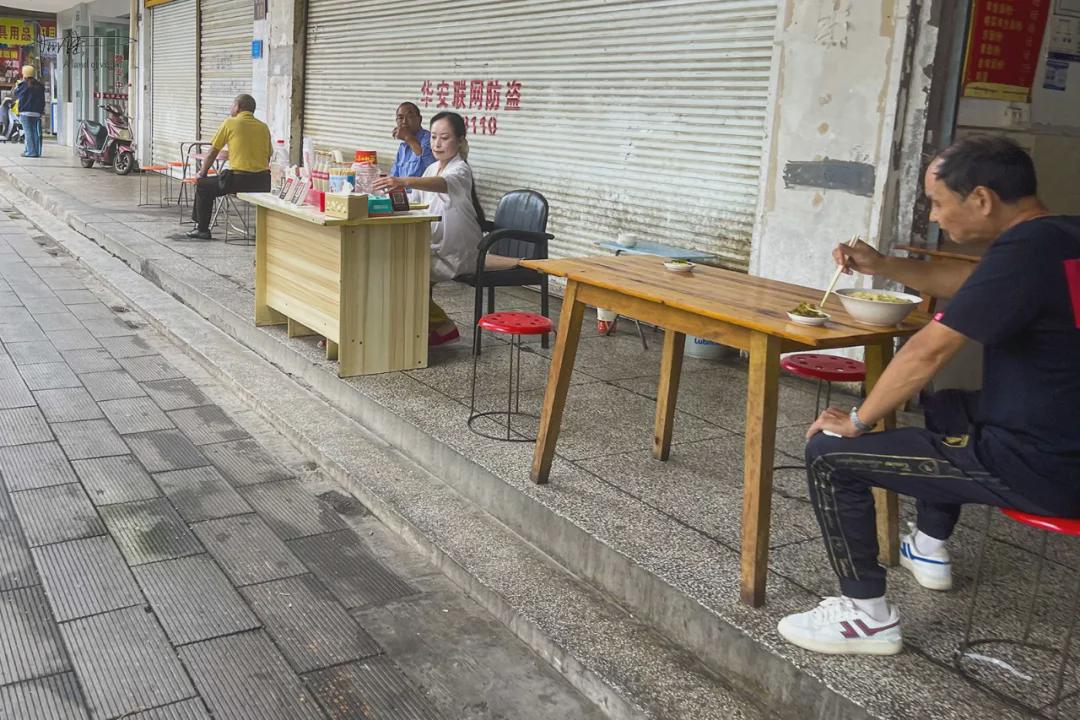 总结这一带之所以早上也这么热闹,应该是跟旁边的学校有很大关系,所以方圆两公里内,我都没搜到有“早酒”服务的餐馆。而越是靠近学校大门口,路边的面馆越多,有的因为生意太好人坐不下,还得临街摆出一排桌椅。让我略感惊艳的是,其中一个摊位的收银小姐姐不仅妆容精致,还身穿白大褂,相信每位路人或者食客经过这里的时候,都会眼前一亮的吧。