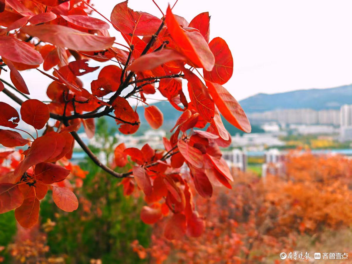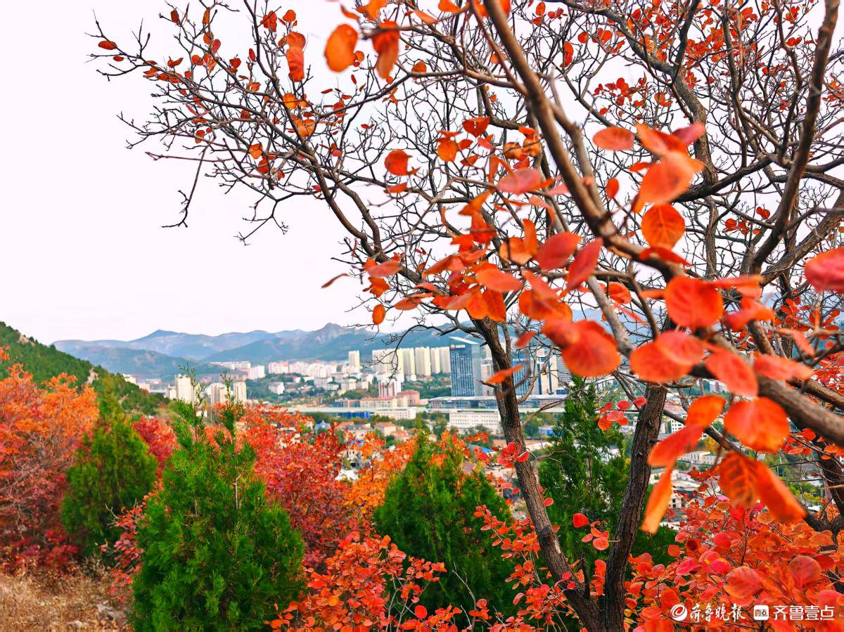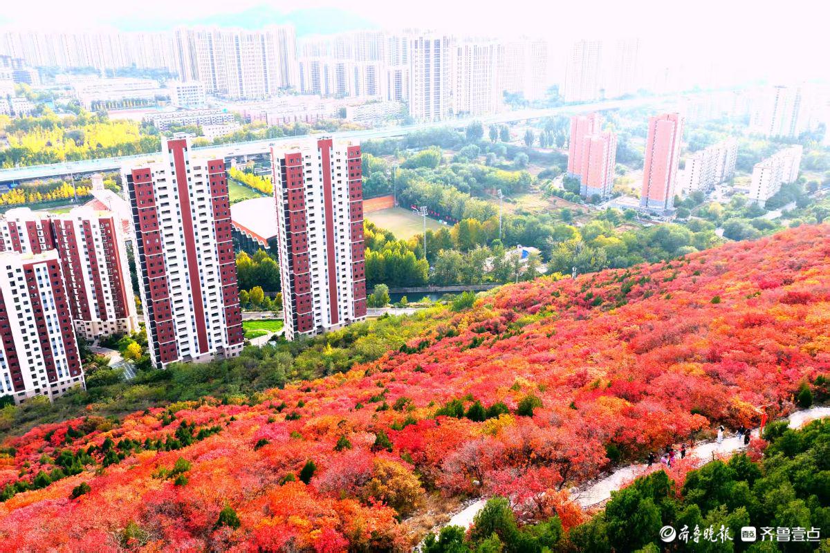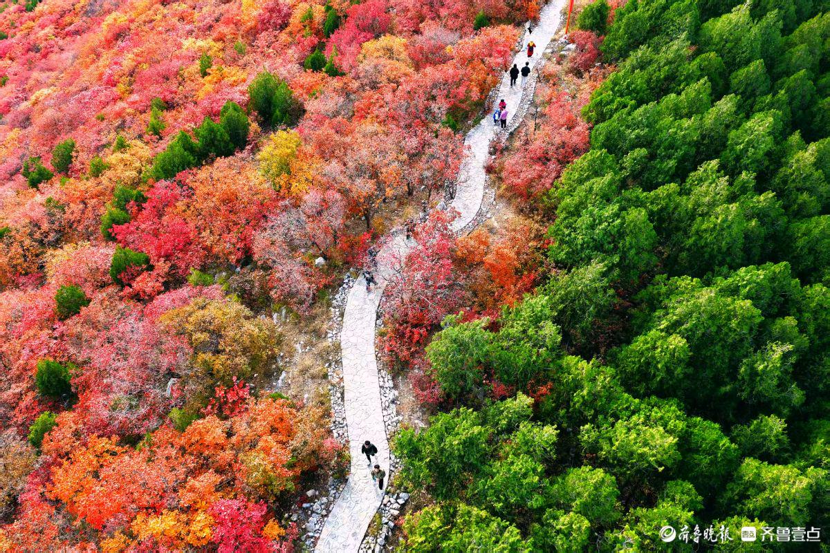 10月29日,济南蝎子山迎来最佳观赏期。深秋时节,山上黄栌褪去翠绿,化作满眼火红,层林尽染间尽显秋意浓。以山脊为天然界限,南侧黄栌林“红似火”,热烈奔放;北侧松柏林 “翠如玉”,生机盎然。从空中俯瞰,红绿双色沿山脊对称分布,山体宛如一锅冒着 “烟火气” 的鸳鸯火锅,独特景致吸引大批市民游客登山打卡,定格这份秋日限定美景。 崔鹏森 摄