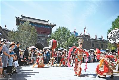夜色苍茫,伴随一阵雄浑的鼓乐声,陕西西安城墙永宁门南广场上,徐徐展开一幅“大唐盛景”。光影交织中,大唐“文武百官”纷纷出城,迎接八方游客。这里是实景演出《梦长安—大唐迎宾盛礼》的现场,精彩表演瞬间点燃了游客的热情。