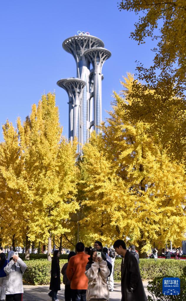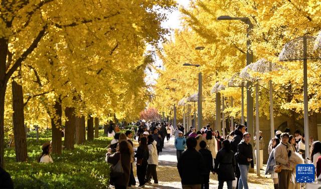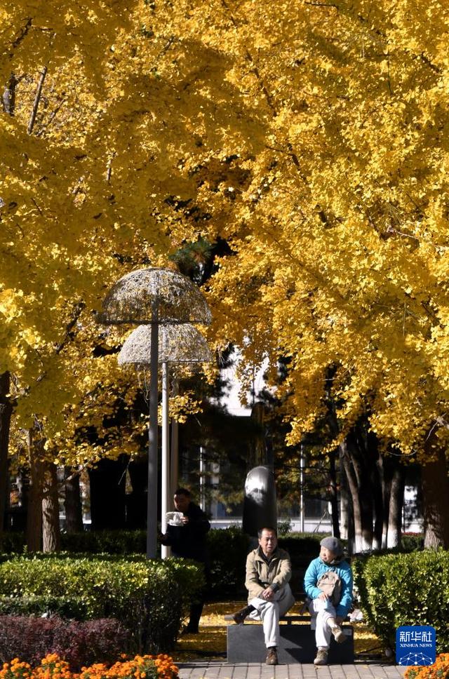 深秋时节,北京市街头和公园内的银杏等树木挂满黄叶,浓浓的秋色吸引大批市民踏秋赏景。