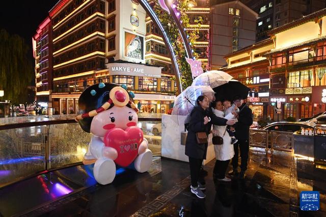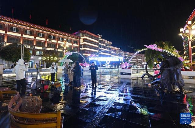 11月1日,游客冒雪在四川省甘孜州康定市溜溜城游览。