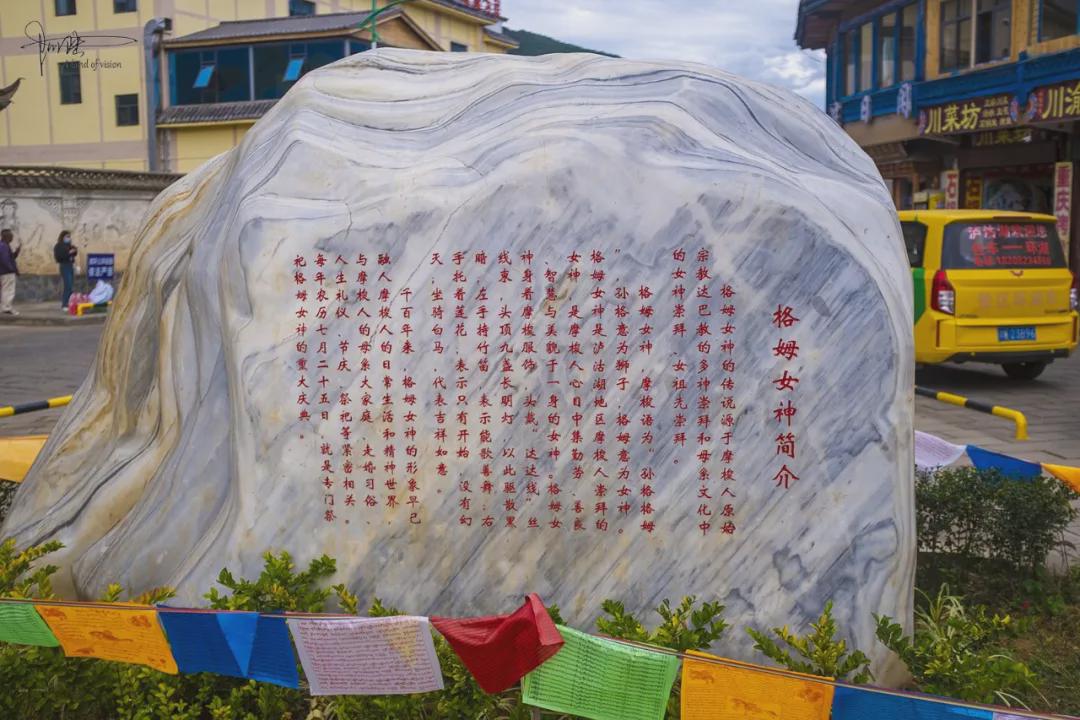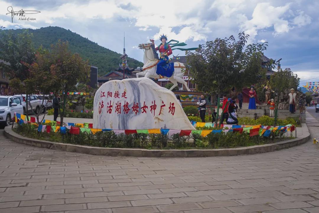 后来到泸沽湖镇上取快递时,又通过偶遇的“格姆女神广场”,对其增加了不少了解。原来格姆女神山也叫狮子山,海拔3700多米,是泸沽湖四周最高的山峰。在摩梭语里,狮子即“格姆”;而在藏语中,又称之为“森格格姆”,“森格”意为狮子,“格姆”意为白色女神,传说中是格姆女神的化身。由此可见,生活在泸沽湖畔的摩梭族人其实一直深受着藏族佛教的影响。