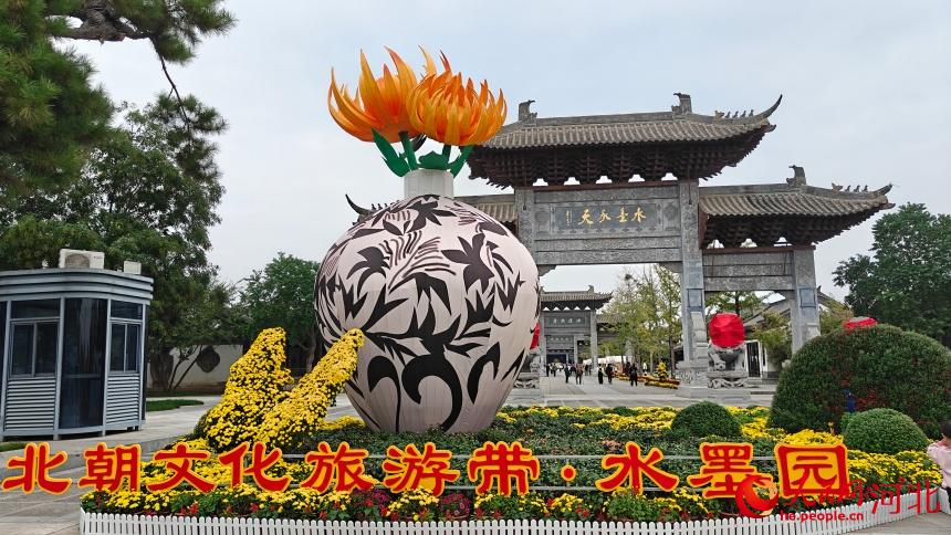 磁州水墨园内,十万盆菊花缤纷绽放,汉服爱好者执扇漫步,与黛瓦白墙构成移动的古画;