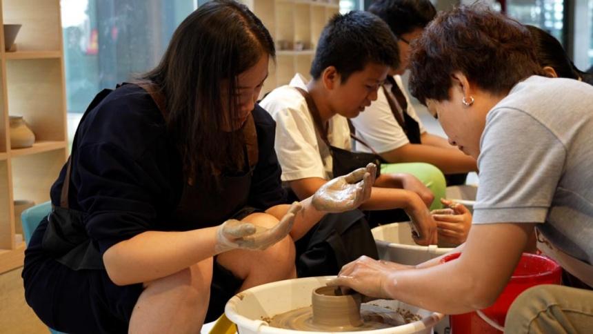 游客在北朝考古博物馆制作陶器。磁县县委宣传部供图