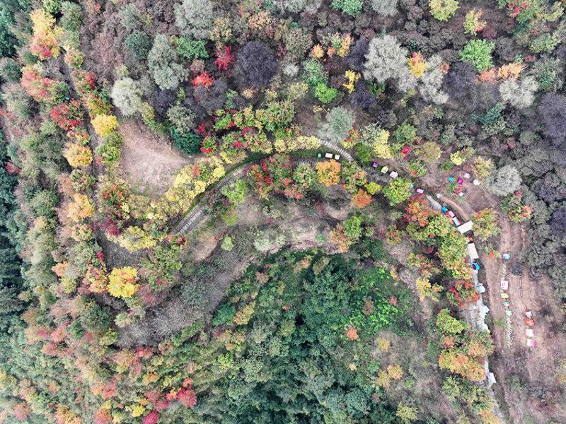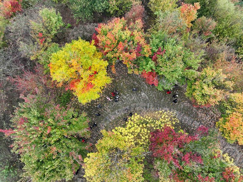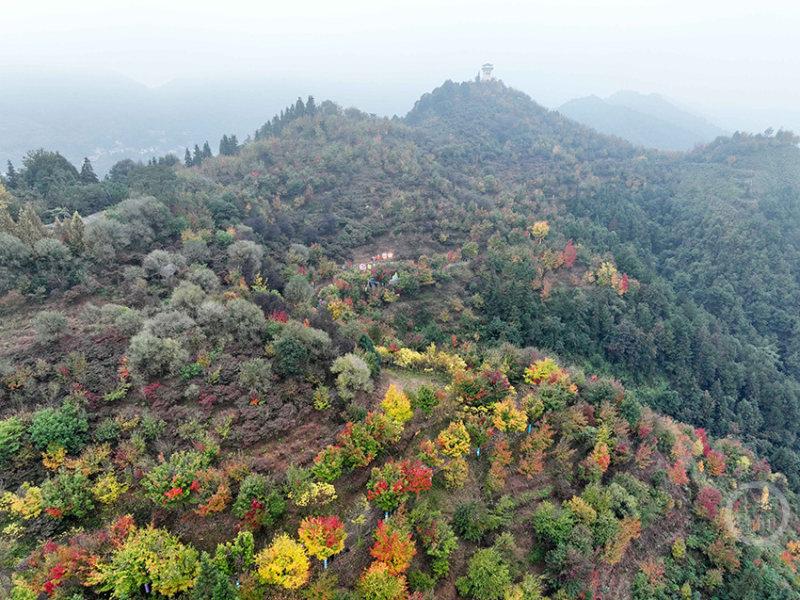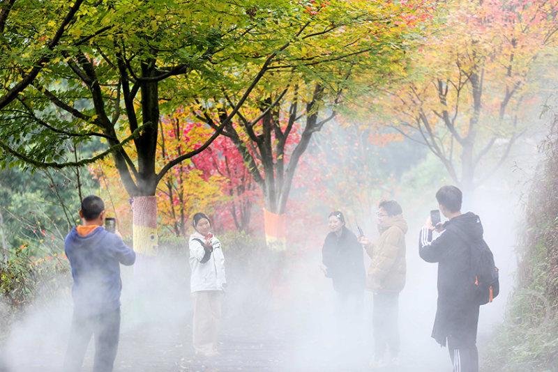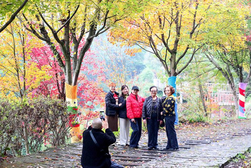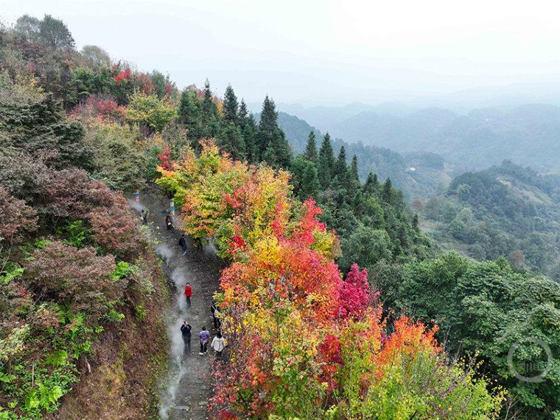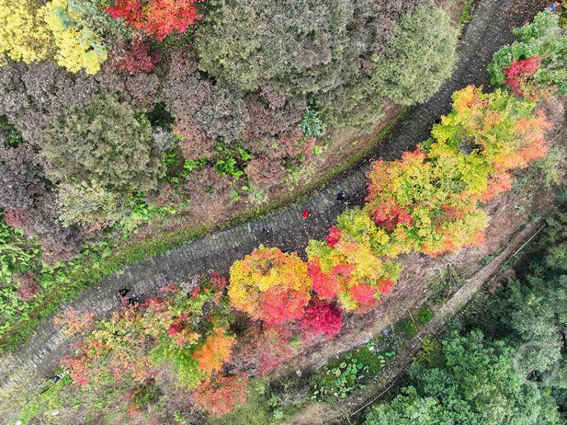 11月6日,在重庆市巴南区丰盛镇油房村,彩色森林层林尽染,宛如大自然的调色盘,吸引不少游客前来观赏。