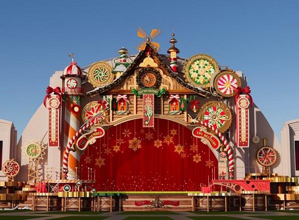 好莱坞剧场将迎来全新冬季限定演出《最棒的礼物》,以高耸风车、糖果风齿轮、闪烁灯饰打造出灵动的精灵玩具工厂舞台,金色机械装置与红绿冬日装饰相映,雪顶木屋、彩灯与礼物堆砌出满溢的节日氛围。