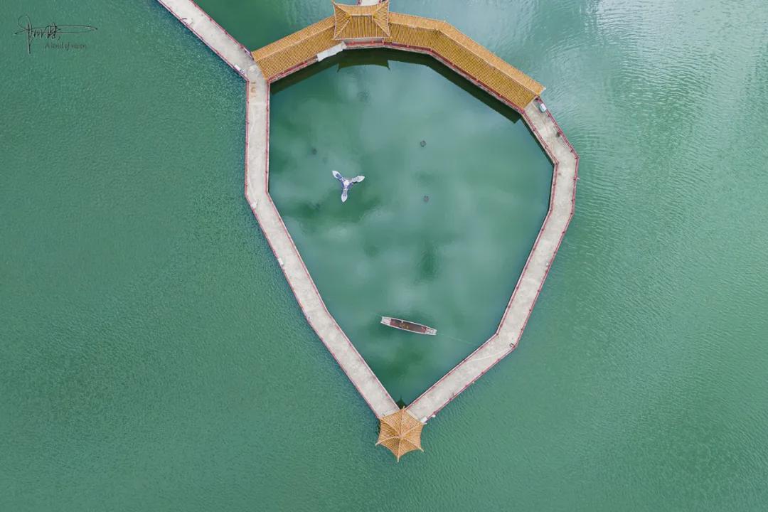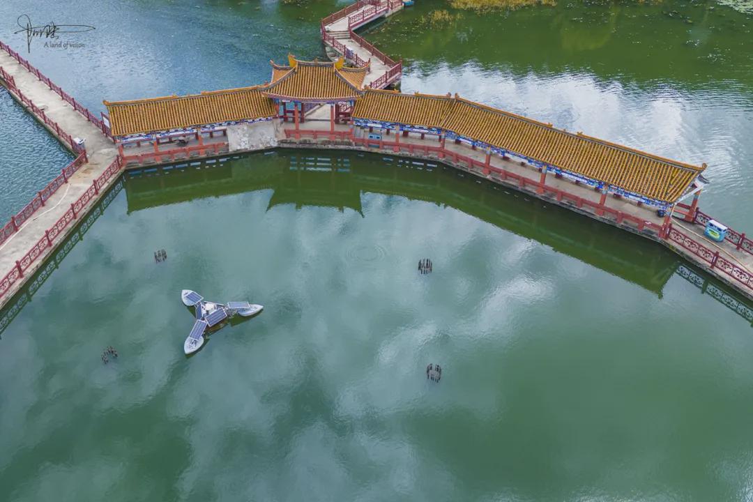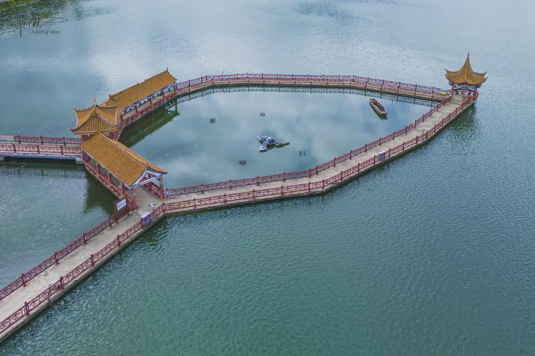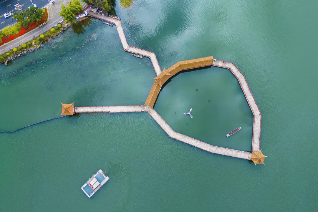 虽然海心亭是现代新造的人文景观而非历史遗迹,但无论栈道、长廊还是六角凉亭,都采用的是传统的经典古风色系,以棕黄色的屋顶搭配红色的护栏扶手,跟四周的环境形成鲜明对比,当游客身置其中,就宛如荡漾在蓝天碧水之间般,随便往哪个方向看,都是能让人心旷神怡的精彩画面。