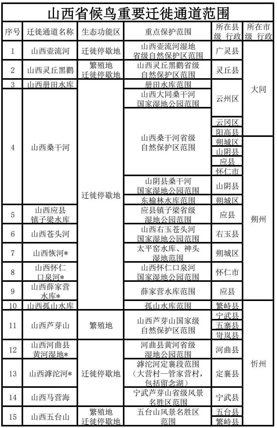 在全国,全球9条候鸟迁徙路线中有4条穿越中国,分为东部、中部和西部三个迁徙区。山西属于中部迁徙区,可进一步划分为:东部太行山候鸟迁徙区、中部桑干河—汾河水鸟迁徙区、西部吕梁山—黄河候鸟迁徙区。每年10月中旬至11月下旬,是候鸟集中南迁的高峰;次年2月下旬至4月下旬,它们又将如约北归。