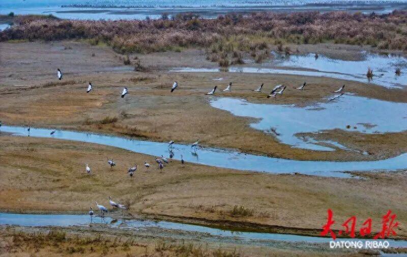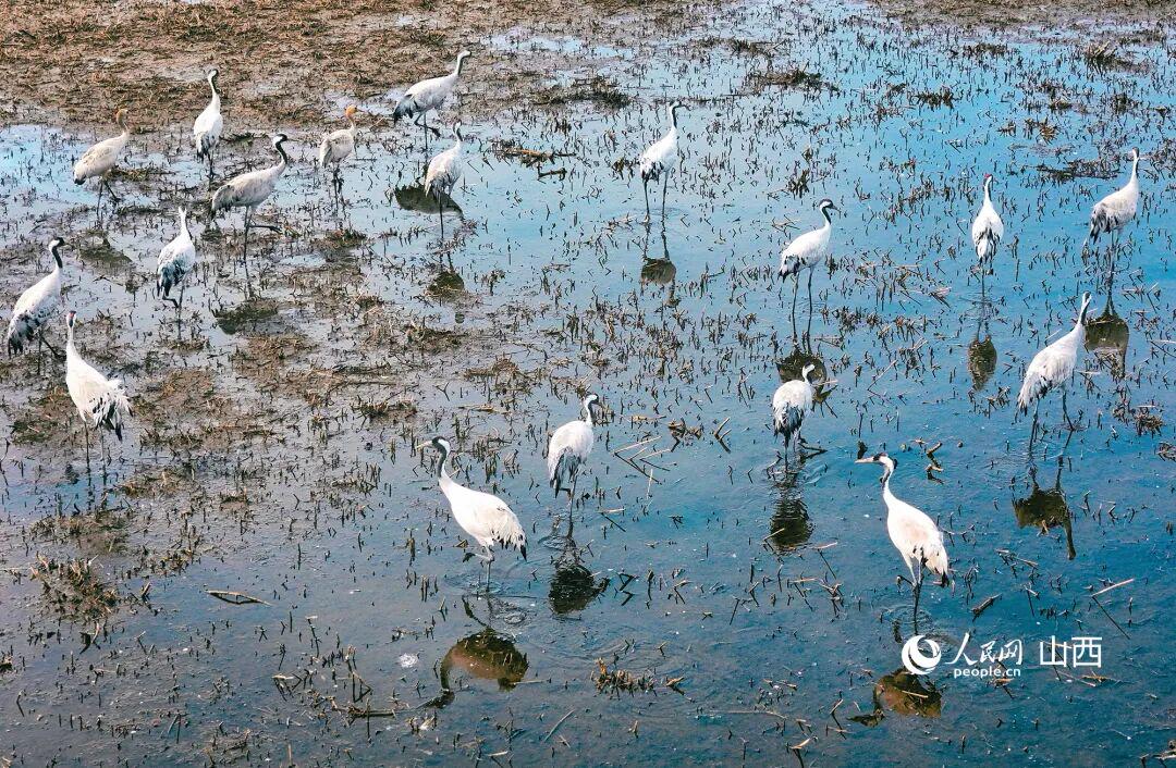 ▲山西大同桑干河国家湿地公园附近停留的灰鹤。