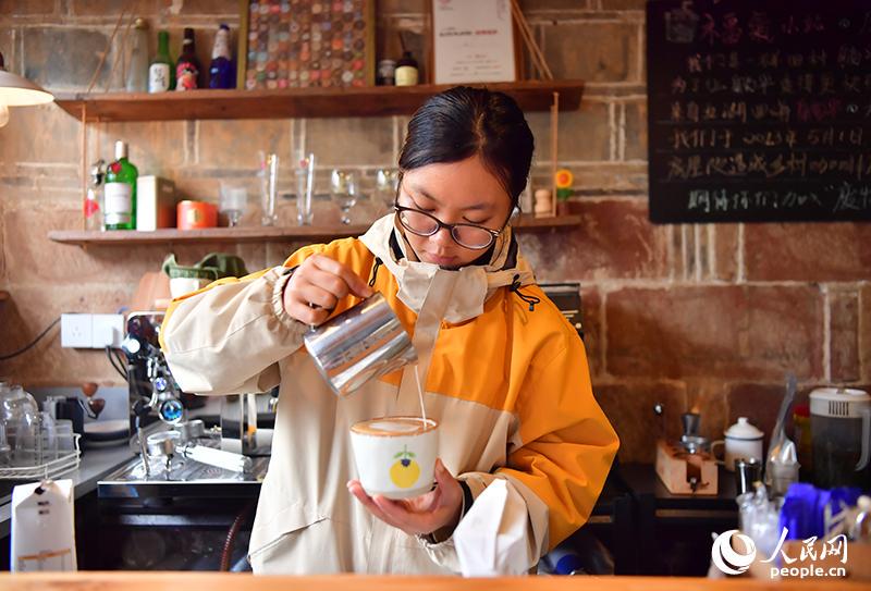 返村创业的青年正在老旧民宅改造的开咖啡馆内制作咖啡。人民网记者 时雨摄