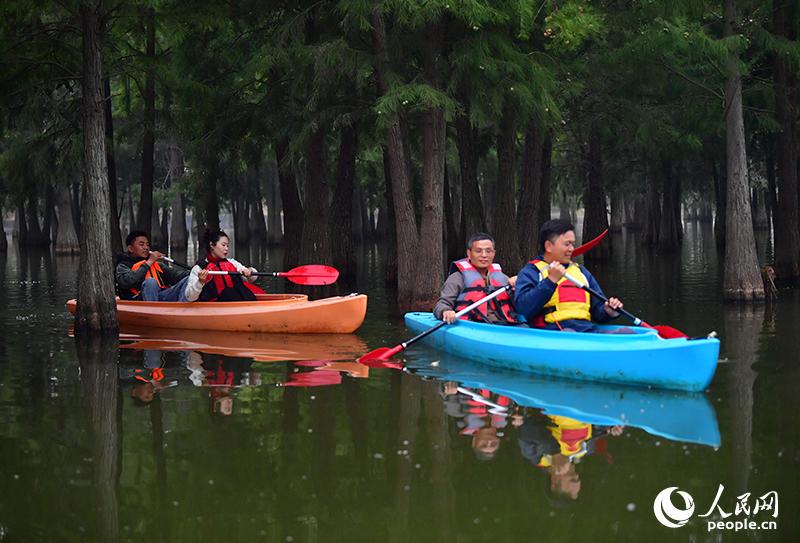 游客在“水杉秘境”中划船游玩。人民网记者 时雨摄