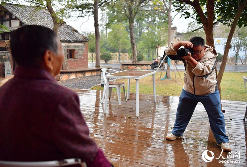 湖陂村“新村民”、自媒体创作者“阿呆不呆”正在免费为村民拍摄照片。人民网记者 时雨摄