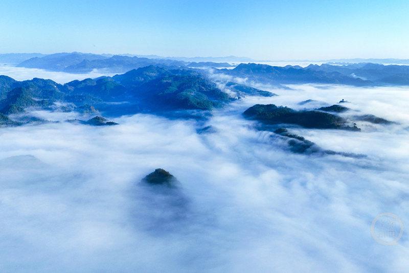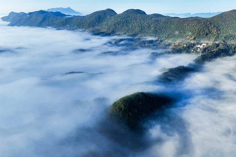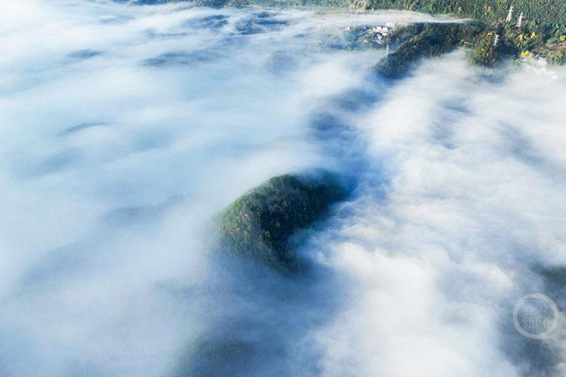 当日清晨,双桥村的山峦被浓密的晨雾包裹,一座座山峰似是大海中的孤岛,在云雾的波涛里“漂浮”。从高空俯瞰,白色的雾气如棉絮般铺满山谷,与苍翠的山林交织,勾勒出极具层次感的绝美画面。