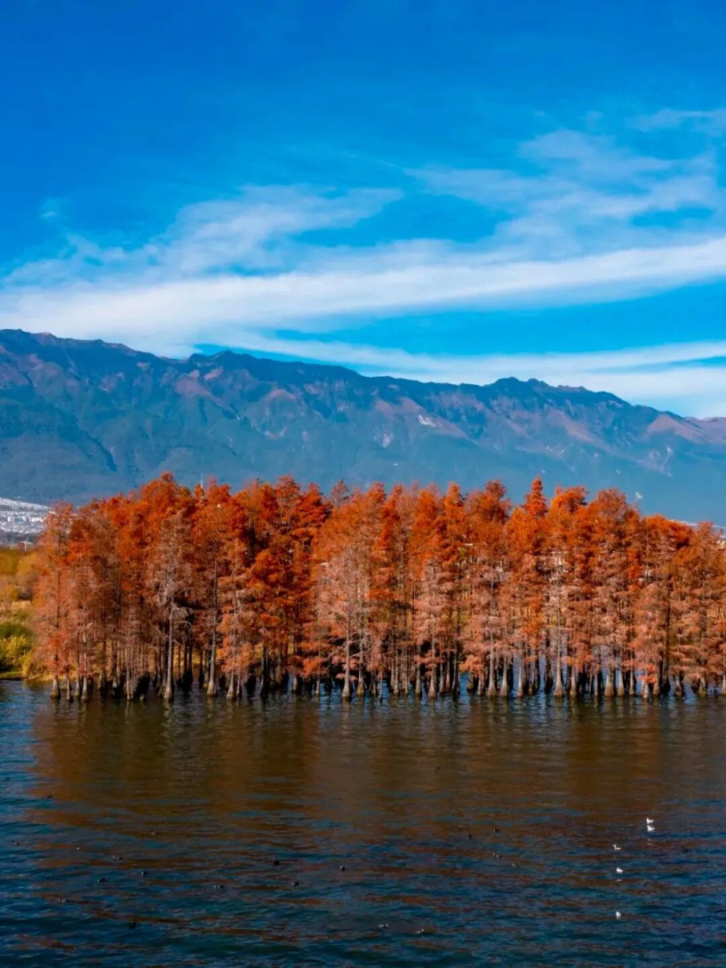 而在大理,洱海生态廊道“水杉红遍”的盛景即将上演。四季轮转,时光沉淀,水杉褪去翠绿,染上绯红,似燃烧的火炬点亮冬日。这抹秋色与碧波荡漾的洱海相映,构成动人的秋日画卷,掠过水面的红嘴鸥,便是其中最灵动的一笔。而骑行的游人穿梭于红杉林间,定格这份独属于大理的温暖秋韵。