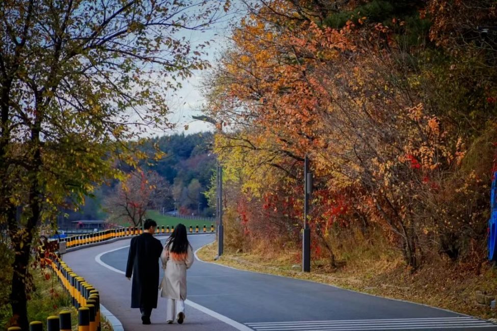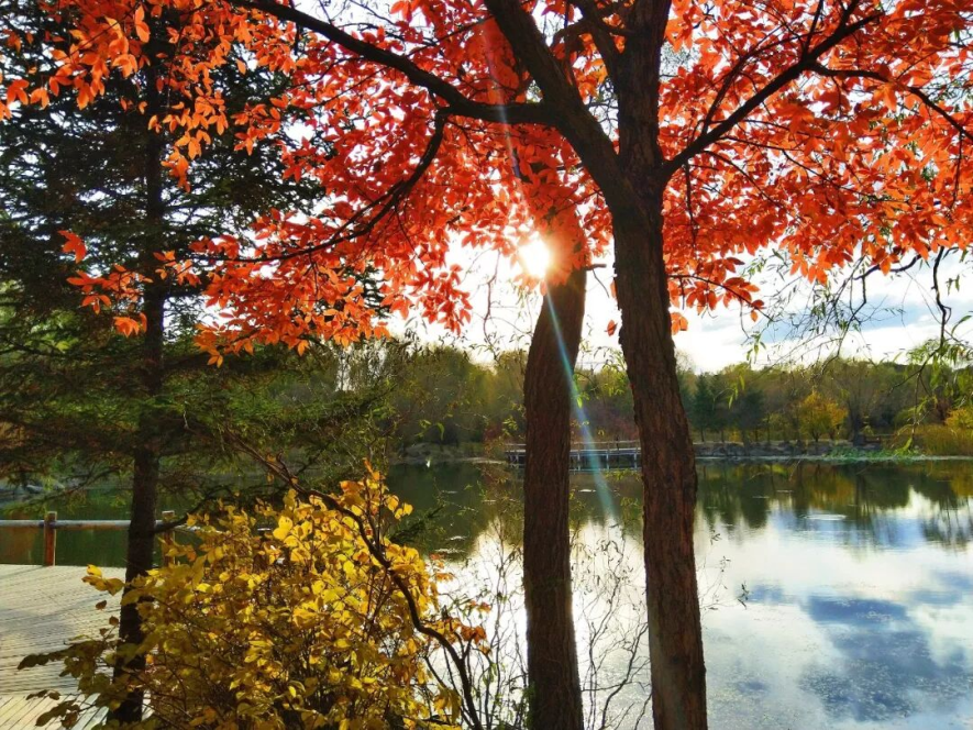 秋日的长春,是净月潭打翻的调色盘。成片的五叶枫与蒙古栎在林间铺展,红色海浪般的红叶与金黄白桦、翠绿松柏交织,将森林栈道变成流动的油画。