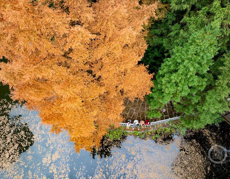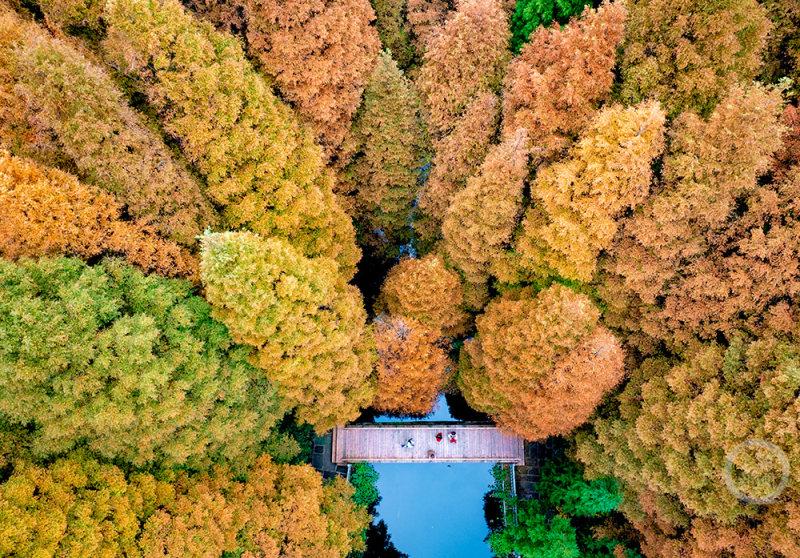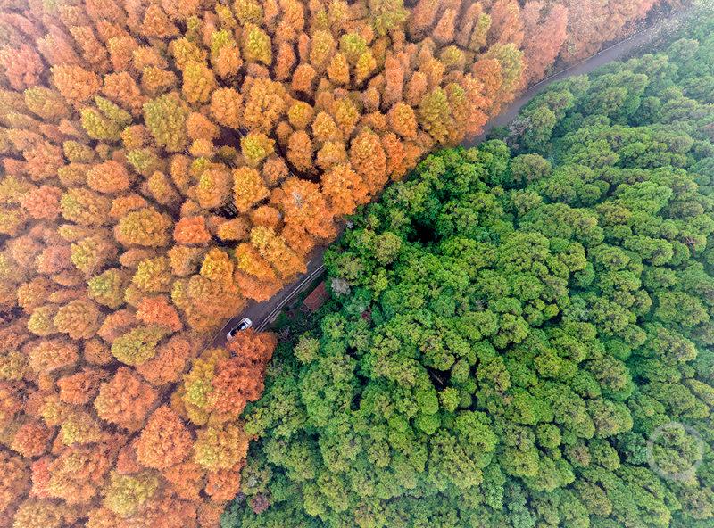 从空中俯瞰,橙红、金黄与深绿的树冠层层叠叠,绵延成色彩斑斓的“海洋”。