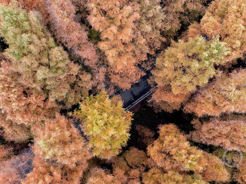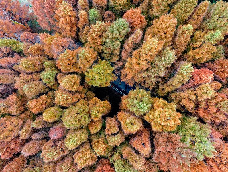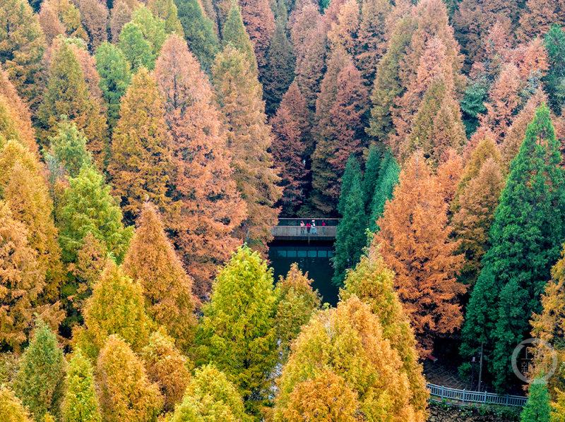 11月15日,重庆市南川区山王坪喀斯特国家生态公园迎来了彩林季,水杉林渐次披上金黄色“外衣”。