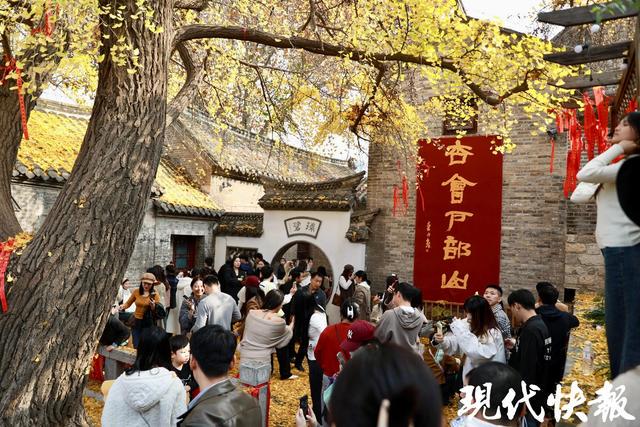 户部山古民居郑家大院环碧花园内,500年树龄的银杏树,身姿优美、杏叶正黄,吸引了众多游客打卡拍照。纪连海参观了项羽戏马台和户部山古民居,在银杏树下他感慨道:“很多地方打卡都是匆匆走过,但户部山是可以坐下享受生活的地方,希望户部山发展越来越好。”