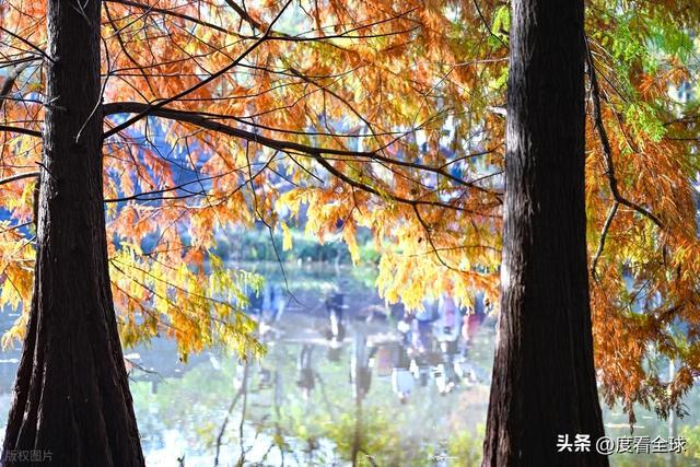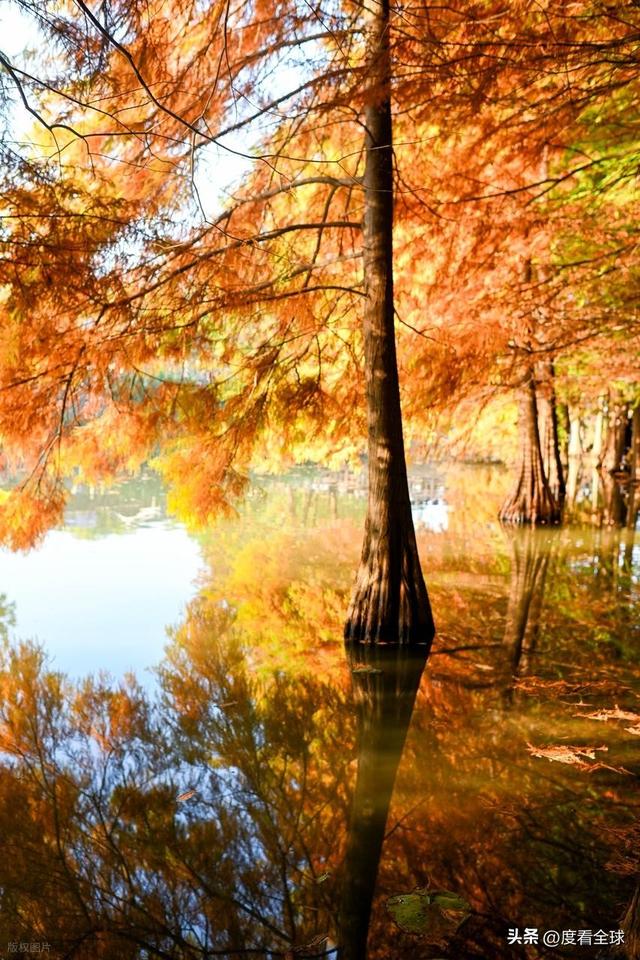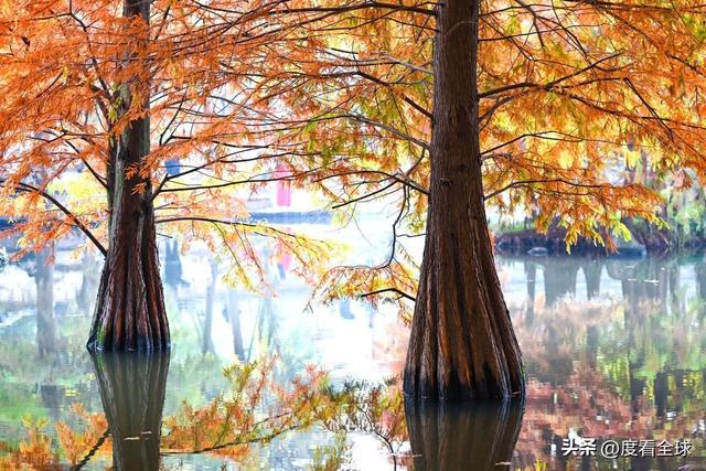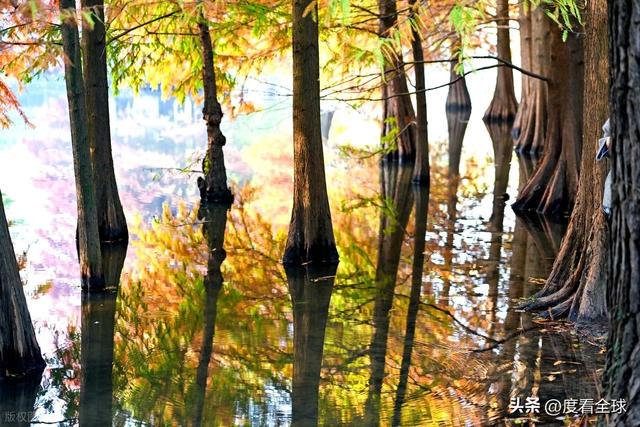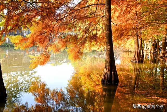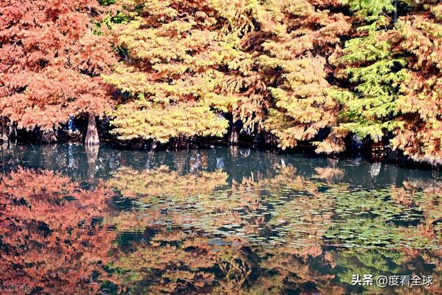 每年 11 月中旬至 12 月初,随着气温逐渐降低,昼夜温差加大,池杉树叶中的叶绿素逐渐分解,类胡萝卜素和花青素开始显现,原本清一色的绿色便逐渐过渡为橙黄、绯红,最终定格为热烈的深红,整个过程如同大自然用画笔精心晕染,每天都呈现出不同的景致,堪称 “一日一景,步步皆画”。