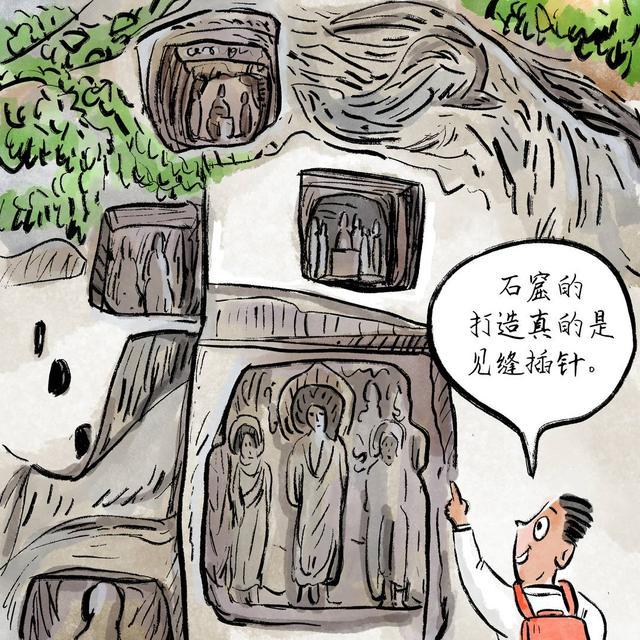 中心柱窟,位于则天殿之上,窟约13立方米,中间有一根完整的石柱,其实是一座造型精美的经塔,三面石壁都刻有佛像,正中是释迦牟尼,左右是文殊、普贤,围绕三尊佛像刻有飞舞蛟龙,据有关人士考证为北周时所刻。
