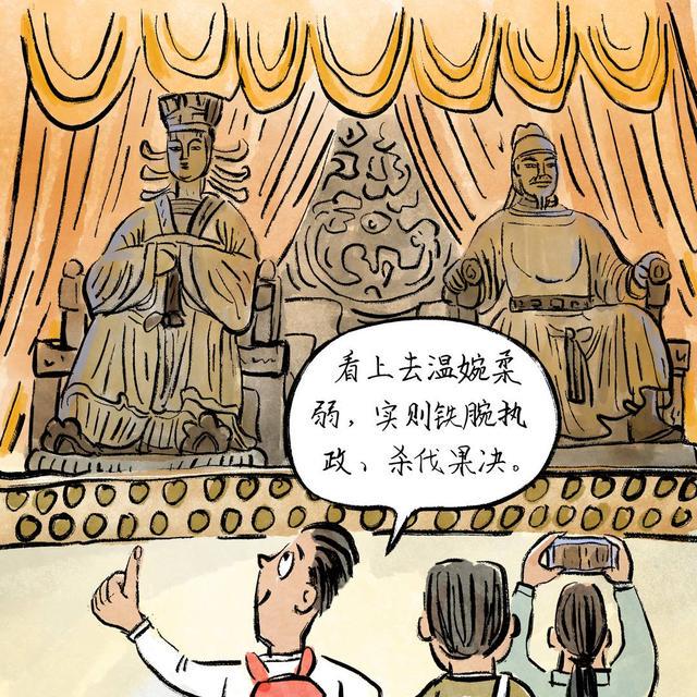 殿内首先映入眼帘的是正中两尊气势恢宏的纯铜塑像,每尊铜像重约一吨。居左为唐朝第三位帝王高宗李治,而旁边的武则天头戴凤冠,此时的身份为唐高宗的第二任皇后。现在人们提到武则天,大多看到她铁腕执政、杀伐果决的一面,却不知她也有女性温婉柔弱和文采飞扬的一面。