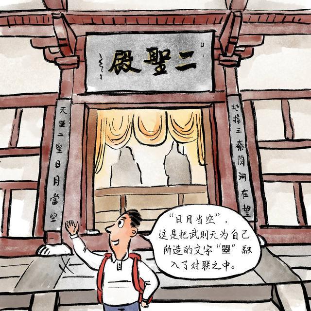来到皇泽寺大门前,郭沫若手书的对联映入眼前,上联是“政启开元治宏贞观”,下联是“芳流剑阁光被利州”。二圣殿是皇泽寺的第一重大殿。殿门两侧悬挂着四川著名诗人流沙河撰写的对联,上联为“地接三秦关河在望”,下联为“天生二圣日月当空”,既包含了二圣殿中二圣临朝的并列主题,又提到了武则天为自己所造的文字——曌,真乃绝妙精准。