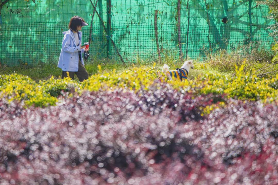 有趣的是在我航拍的时候,还真发现了一人一狗正来来回回、若隐若现地“荡漾”其间。可惜当他们发现无人机后,似乎就立即收敛了很多,没再继续奔跑互动。等我拿出长焦镜头抓拍两张后,更是很快就消失在某片树丛的深处,猜测他们应该是从我对面,也就是另一边的小路进来的。