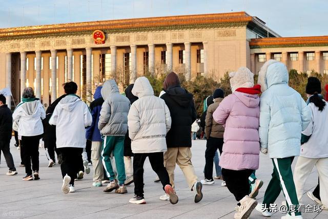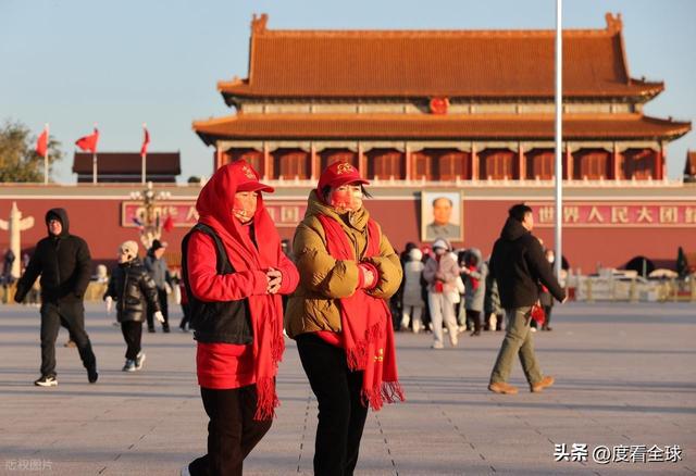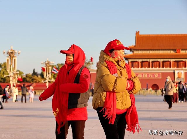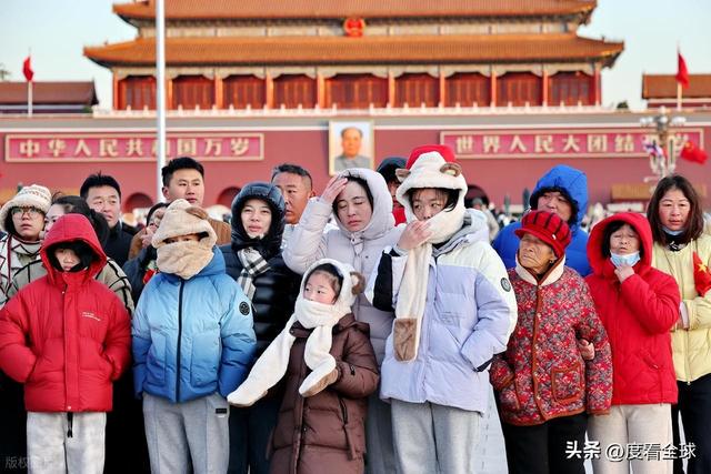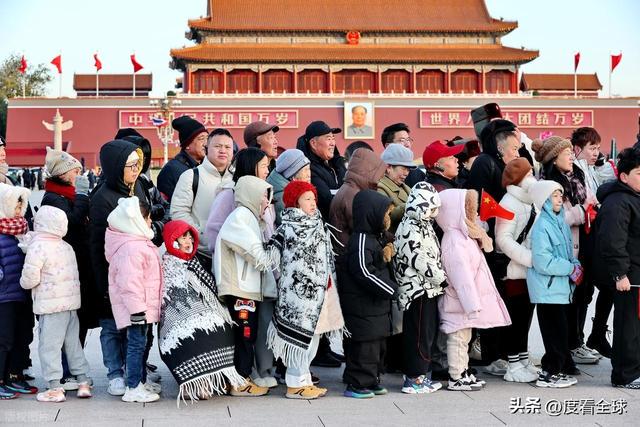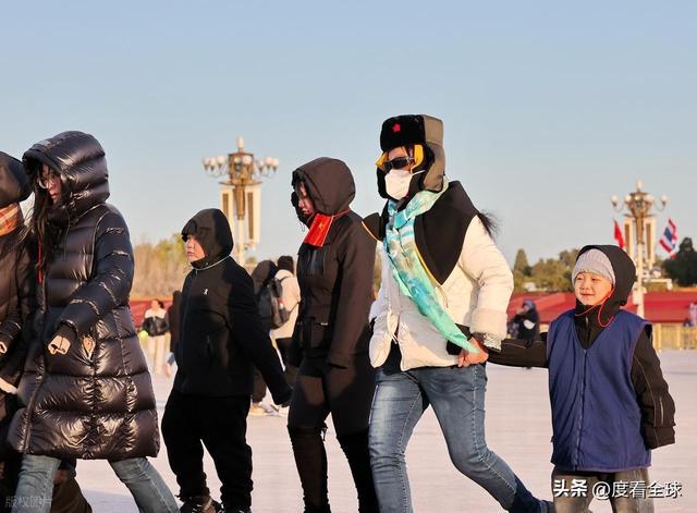 当天,这样的场景在天安门广场随处可见。游客们大多穿着颜色鲜艳的厚羽绒服,深色的棉帽子、各色的围脖成为广场上最亮眼的 “标配”,有人甚至戴上了防风护目镜,把自己裹得像 “粽子” 一样。不少家长把孩子抱在怀里,用自己的外套裹住孩子的身体,只露出小脑袋;老年游客则互相搀扶着,脚步虽缓,但眼神中满是对天安门的崇敬与向往。广场上的执勤民警、环卫工人、志愿者们也同样在寒风中坚守岗位,民警们穿着厚重的执勤服,依然保持着挺拔的姿态,认真疏导着人流;环卫工人戴着厚厚的棉手套,挥舞着扫帚清理落叶,脸颊被冻得通红;志愿者们则耐心地为游客解答咨询,指引路线,偶尔搓一搓冻僵的双手,却始终保持着热情的笑容。