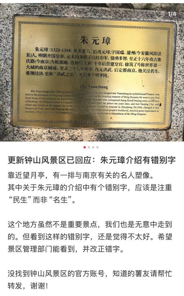 现代快报讯(记者 裴诗语/文 赵杰/摄)11月17日,有网友发帖指出,南京5A级景区钟山风景名胜区内,一处介绍明太祖朱元璋的标牌存在低级笔误,将“民生”误写为“名生”。
