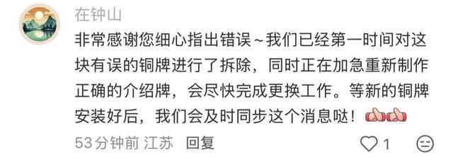 11月18日,景区方面回应称,已第一时间拆除了这块有误的铜牌,同时正加急制作正确版本的介绍牌,将尽快完成更换。当天下午,现代快报记者赴现场探访,确认有误铜牌已拆除完毕。