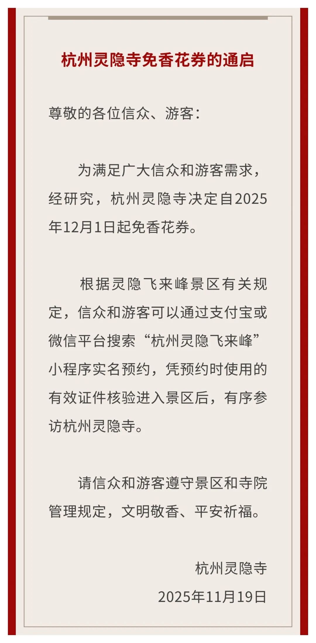 11月19日,记者从杭州西湖景区官方账号了解到,自2025年12月1日起,灵隐飞来峰景区(含灵隐寺、永福寺、韬光寺)实行免票政策,开放时间每日7:30-17:30(17:00停止入园)。