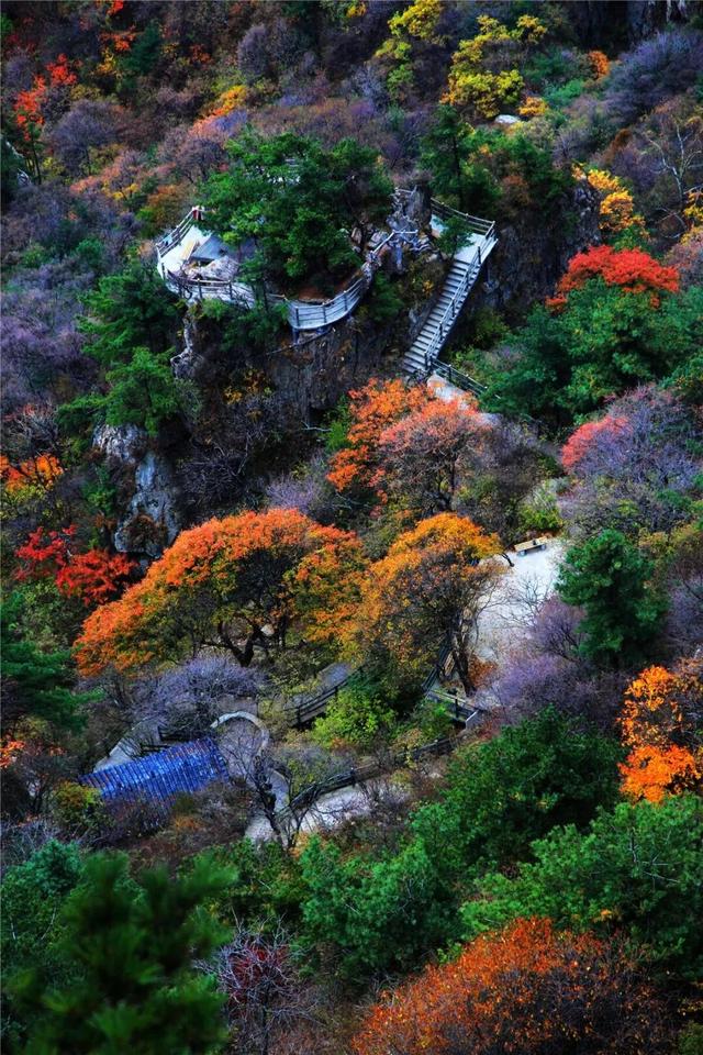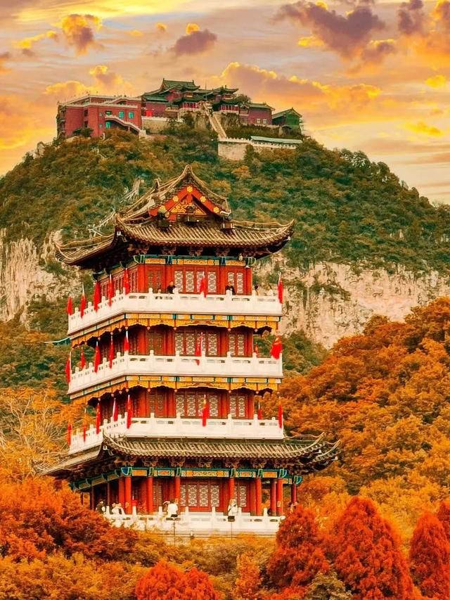 看枫叶,怎么能错过王维诗中的云台山?火红的五角枫,勾勒出秋日的美好,在王维作诗的重阳阁,静看万山红遍。
