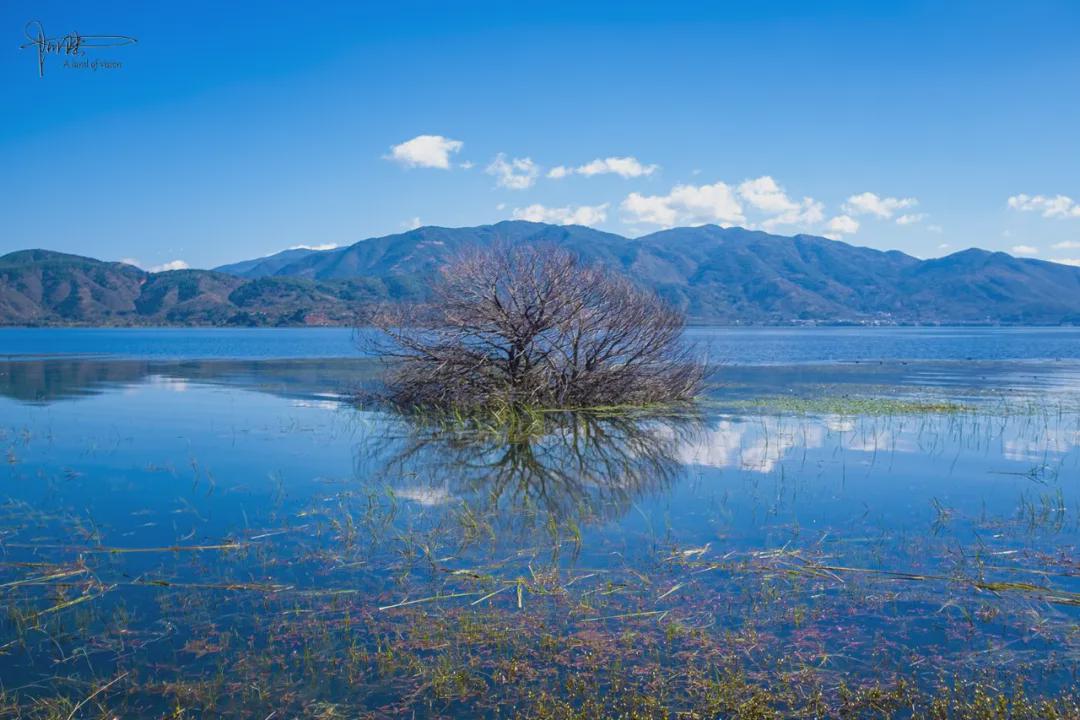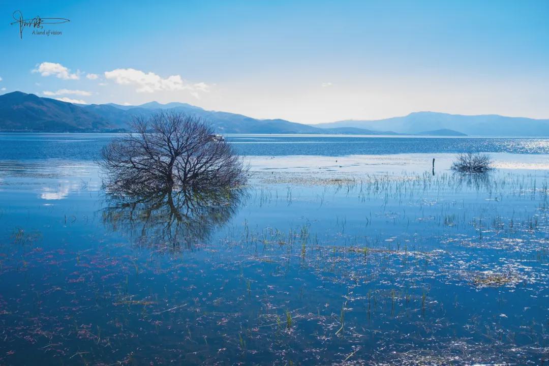 有意思的是,后面沿着海边骑行,我还曾经一度陷入“几十米一停”的尴尬,因为这里不仅富含湿地一般的自然景观,草海泛滥,还有许多枝干扭曲盘绕的老树,它们一半淹没在水里,一半露出在水面之上,画面着实惊彩。而一辆宏光MINI电车,就跟在我的后面也同样走走停停了好久,反正我当时拍的树,那位帅哥驾驶员手机里应该“复制”取景了一大半,呵呵。